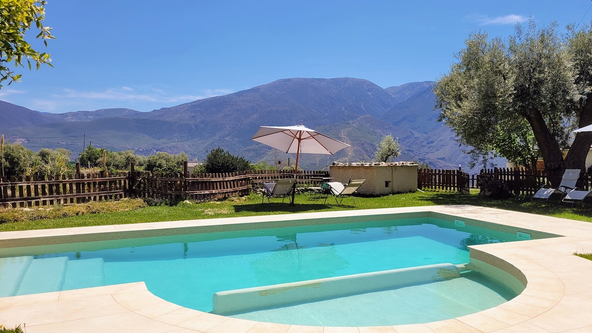 Casa acogedora en un tranquilo y bonito entorno rural de montaña en Granada. Ubicada en un pequeño pueblo junto al Parque Natural de Sierra Nevada, a 25 min de Granada, 20 min de La Alpujarra y 25 min de la playa. La casa tiene dos plantas y un patio exterior con pequeña piscina, exclusivo para ti. Planta de abajo: distribución abierta con salón, comedor, cocina, pequeño aseo y patio. Planta superior: dormitorios y baño completo. Rutas de senderismo a 5 min a pie desde el alojamiento.