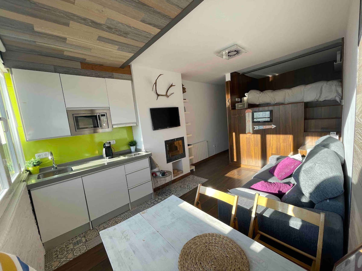 Apartamento de lujo a pie de pista, en la Plaza Maribel. Consta de una habitación con cama de matrimonio y altillo en salón con otra cama de matrimonio. Plaza da garaje incluida , guardaesquís. Acceso de Piscina Climatizada gratuito abierto de de 15:30h a 19:30h de L a D, excepto el miércoles que esta cerrado. Necesario: gorro, chanclas y toalla de baño. NO NOS RESPONSABILIZAMOS de que la comunidad pueda decidir no abrir la piscina por tareas de mantenimiento.