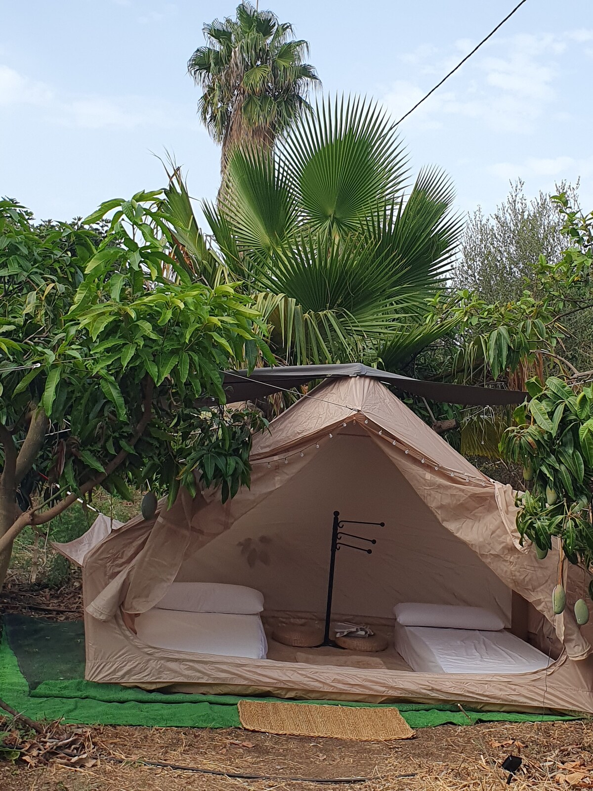 De tent staat midden in de boomgaard met citroen en sinaasappelbomen. Via een pad door de tuin (verlicht) kom je bij het houten plateau waar de tent op staat. De tent beschikt over een bed en stoelen met tafel. Deze kunnen gebruikt worden om bijvoorbeeld te genieten van de zonsondergang of het bewonderen van de sterrenhemel in de avond. Het zwembad biedt de nodige verkoeling en er zijn ligbedden om heerlijk te ontspannen! Er kan gebruik gemaakt worden van de buitenkeuken.