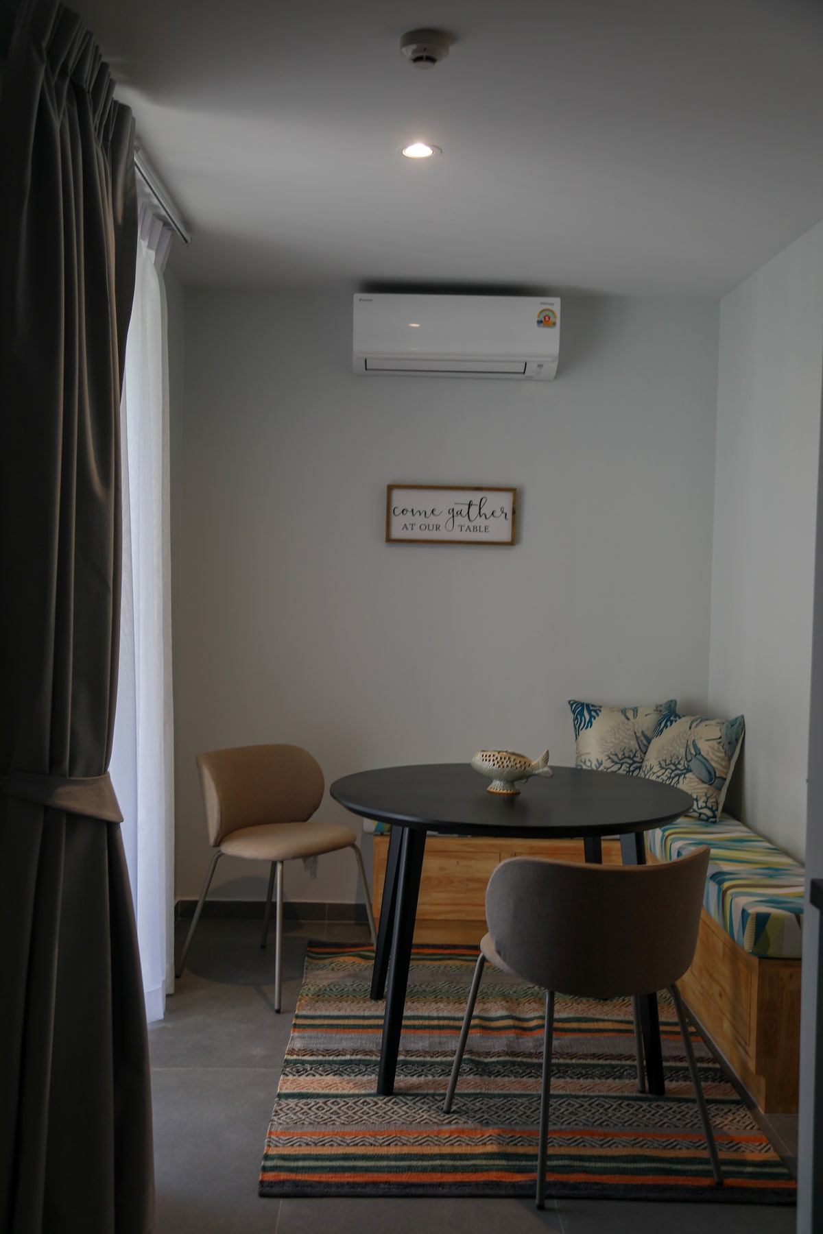 Our Studio Kitchenette accommodates up to three guests and offers flexible bedding with one king-size bed plus a twin bed , ideal for small groups or families with young children. The kitchenette includes a stove, microwave, refrigerator, and dining nook for simple meal preparation. Bright and comfortable with large windows and natural light, this room is well suited for short-term, weekly, or monthly stays in Mai Khao, Phuket.