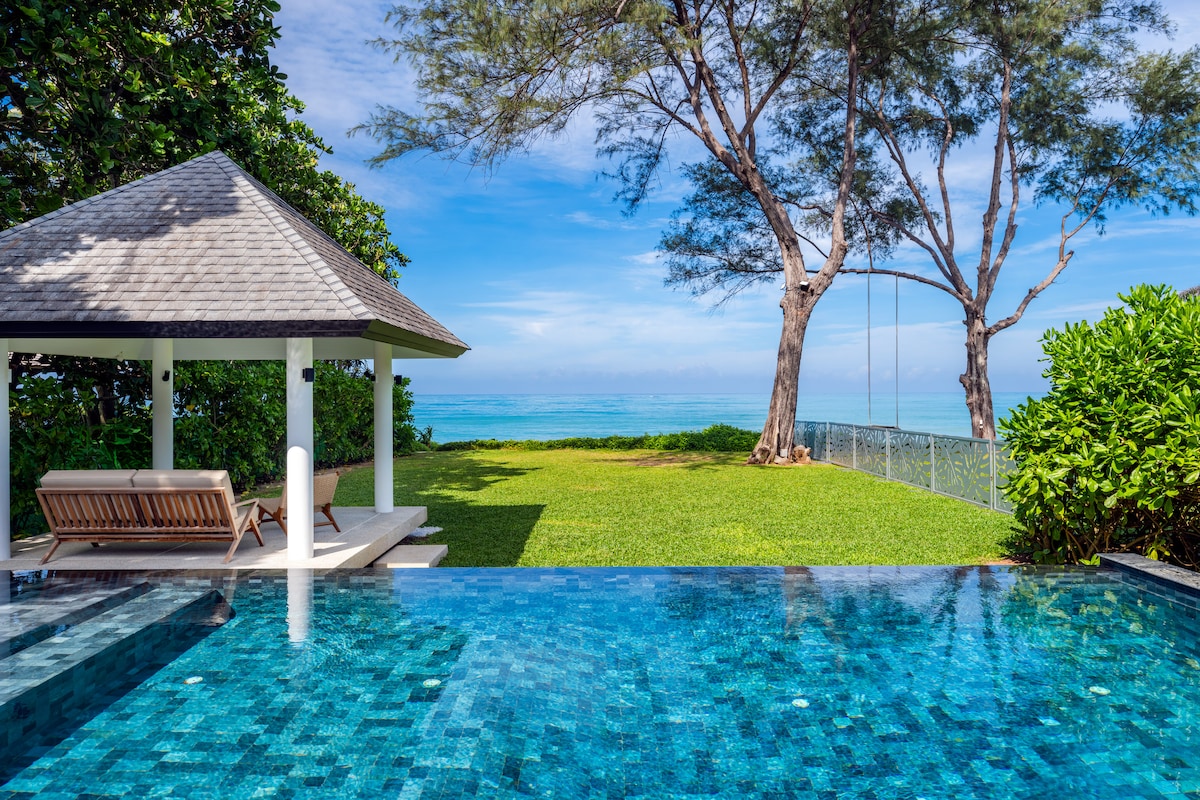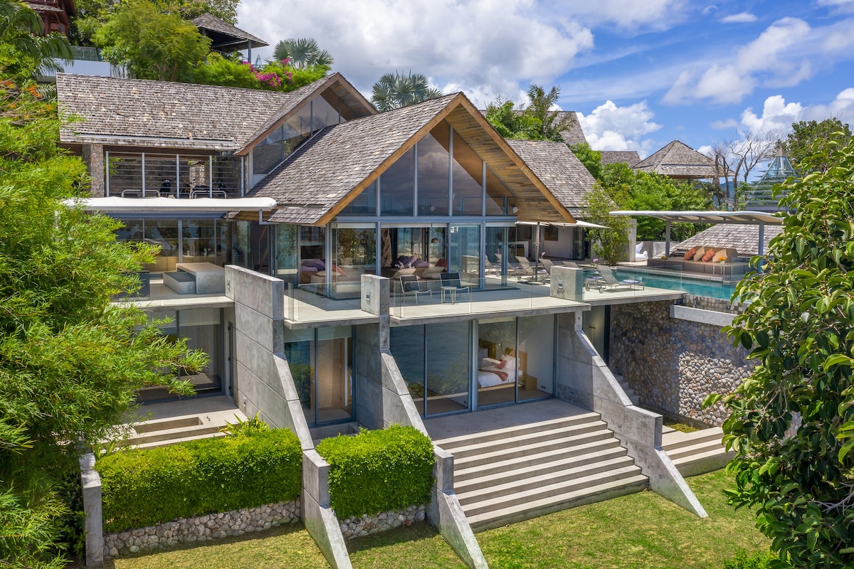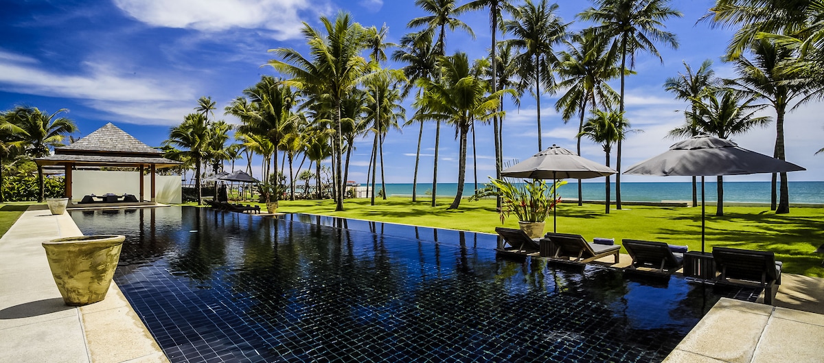 This spectacular beachfront villa is located within the Laemson Estate on the western shore of Phuket, in an area known as "Millionaire's Mile." Nestled on a headland amid lush palm trees and gardens, the villa has the feel of a private resort unto itself, with exquisite living areas, a large pool, excellent wellness amenities, and a lovely private beach just steps from the pool terrace. Designed in a classic Thai style enhanced with contemporary amenities, the home includes six ocean-view bedroom suites divided between five pavilions, accommodating twelve guests in all.