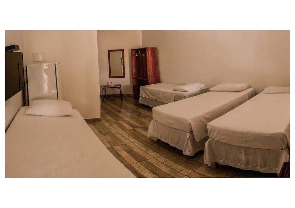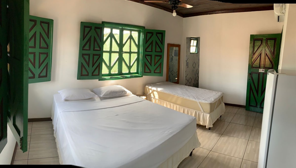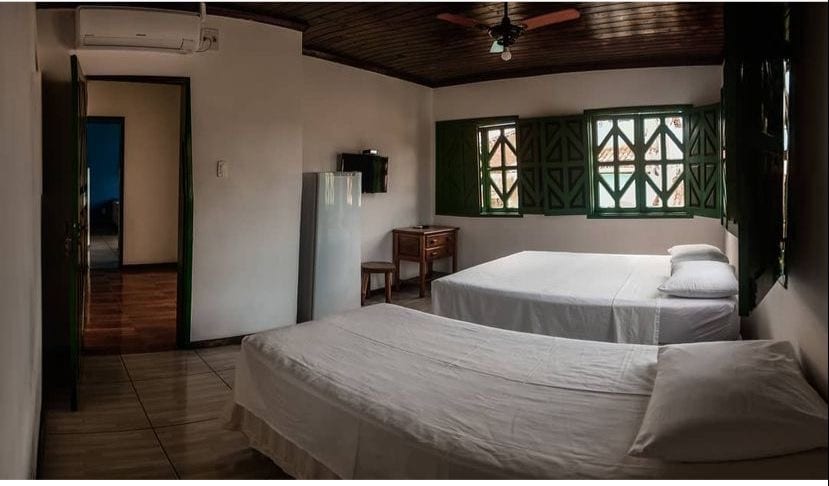 O quarto é equipado com uma cama de casal e uma cama de solteiro, banheiro privativo, além de TV, frigobar e ventilador. Para utilizar o ar condicionado, é acrescido R$20 na diária. Esse quarto pode ser equipado com cama de solteiro adicional, se necessário.