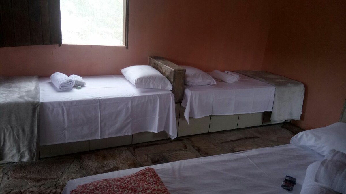 São Chalés de pedra forrados, com telas nas janelas, camas de alvenaria, banheiro interno e externos, aquecedor de água, piscinas naturais e cachoeiras próximas.