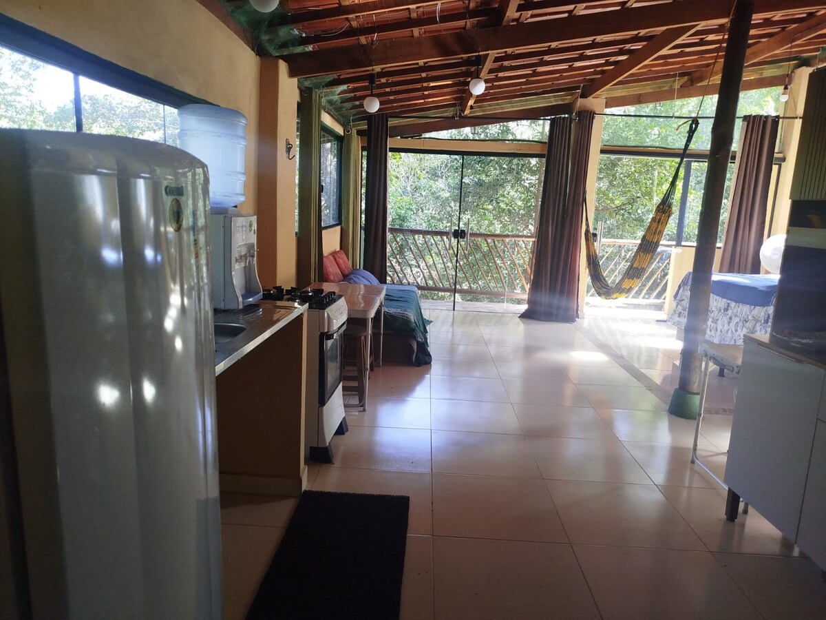Um refúgio amplo, arejado e silencioso, onde o verde entra pelas janelas e o tempo desacelera. Cercada por mata exuberante, na divisa do Parque Nacional da Chapada Diamantina, a casa é embalada pelo canto dos pássaros e o som das cigarras. A 5 minutos das trilhas do Ribeirão do Meio e da Cachoeira do Sossego, e a 14 minutos a pé do centro de Lençóis. No mato, mas com calçamento e sem buracos. O raro equilíbrio entre natureza profunda e cidade viva. Um lugar de descanso, presença e silêncio =)