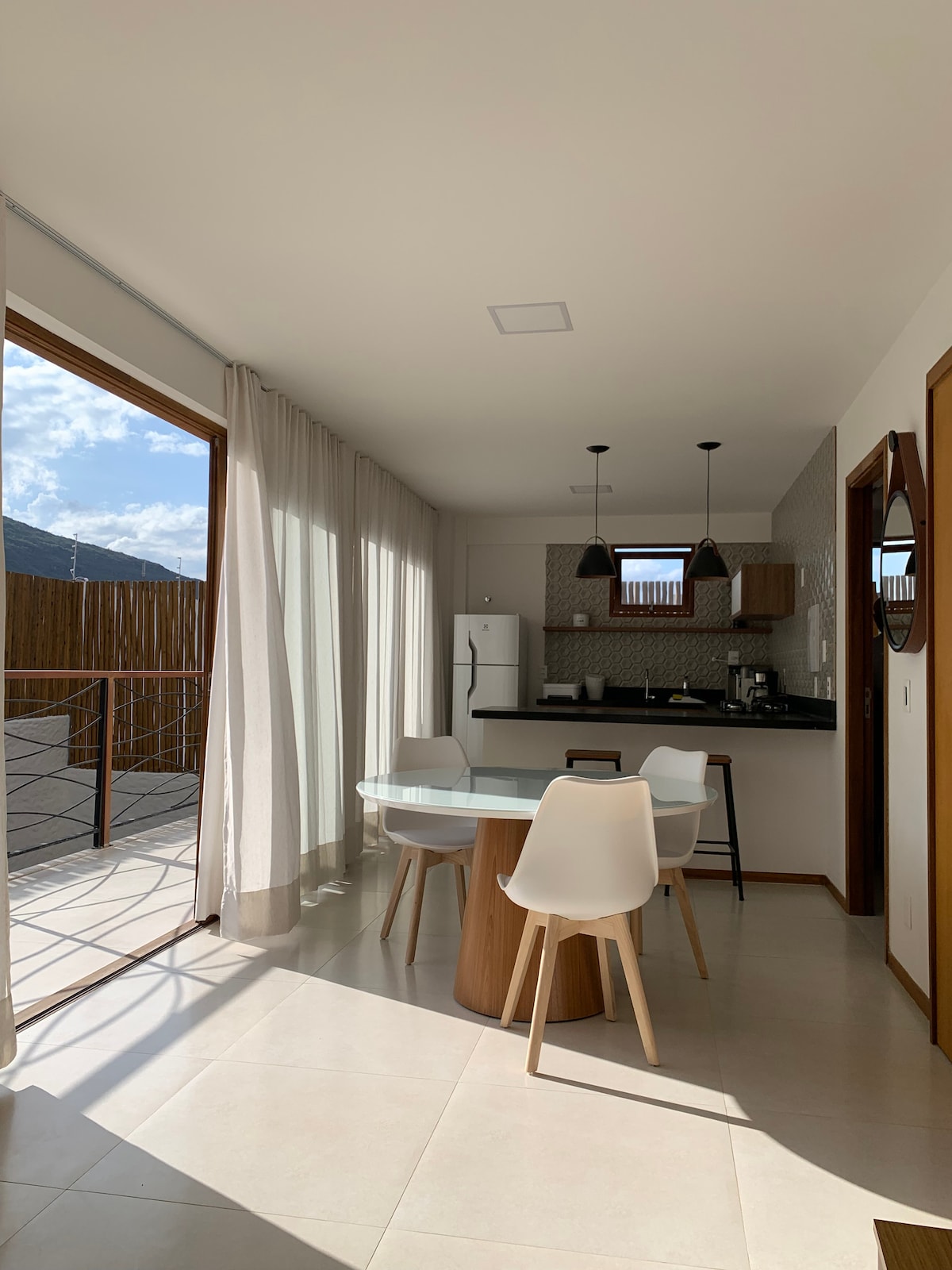 Curta uma experiência elegante neste lugar bem-localizado, a 200m do centrinho de Mucugê. - Sala conjugada com a cozinha e varanda, com grandes portas de vidro para deixar entrar muita luz e vista das montanhas. - 1 suíte equipada com ar-condicionado, ventilador e camas box. - Wi-fi, Netflix e Prime Vídeo disponíveis. - Estacionamento privativo com 1 vaga coberta. - Máquina Nespresso, cooktop, sanduicheira etc.