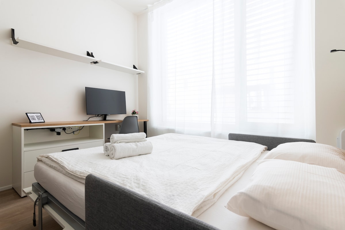 ⚡️ Reach Old Town in 10 min for €1.5 ⚡️ WiFi - Ultra Fast 1Gbps ⚡️ A/C for a comfortable stay ___ • Built-in 2023, modern 20m² studio • Bed pulls out from wardrobe, covers sofa • Paid parking via “Mr. Parkit” in building across • SMART TV w/Netflix, O2TV • Fully equipped kitchen + Washer • Near shops, cafes, nightlife • “Novy Smichov” mall 5min walk • Workspace for remote work • Nespresso coffee and tea • Metro “Anděl” & Tram 5min walk • 25 min walk to City Center • Electric exterior shutters