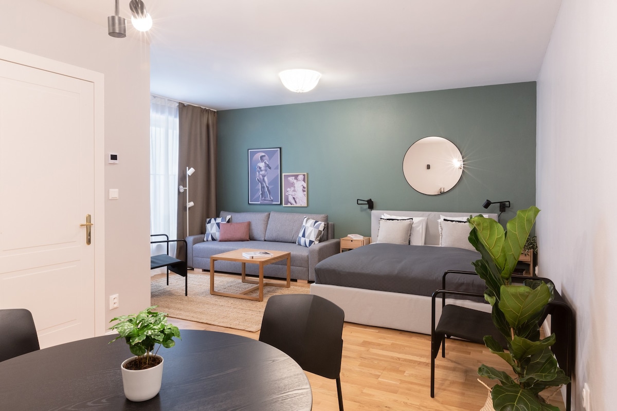 Experience the brand new stylish fully furnished apartments designed by renowned architectural studio Nedvěd Architekti where you can find everything from comfortable beds to towels and coffee cups. The carefully renovated building has preserved the best of history and added everything that modern housing requires. Make yourself comfortable! • 5 minutes to the heart of Prague • 80 meters to the nearest café • 1 stop from the main railway station • Steps away from metro and tram