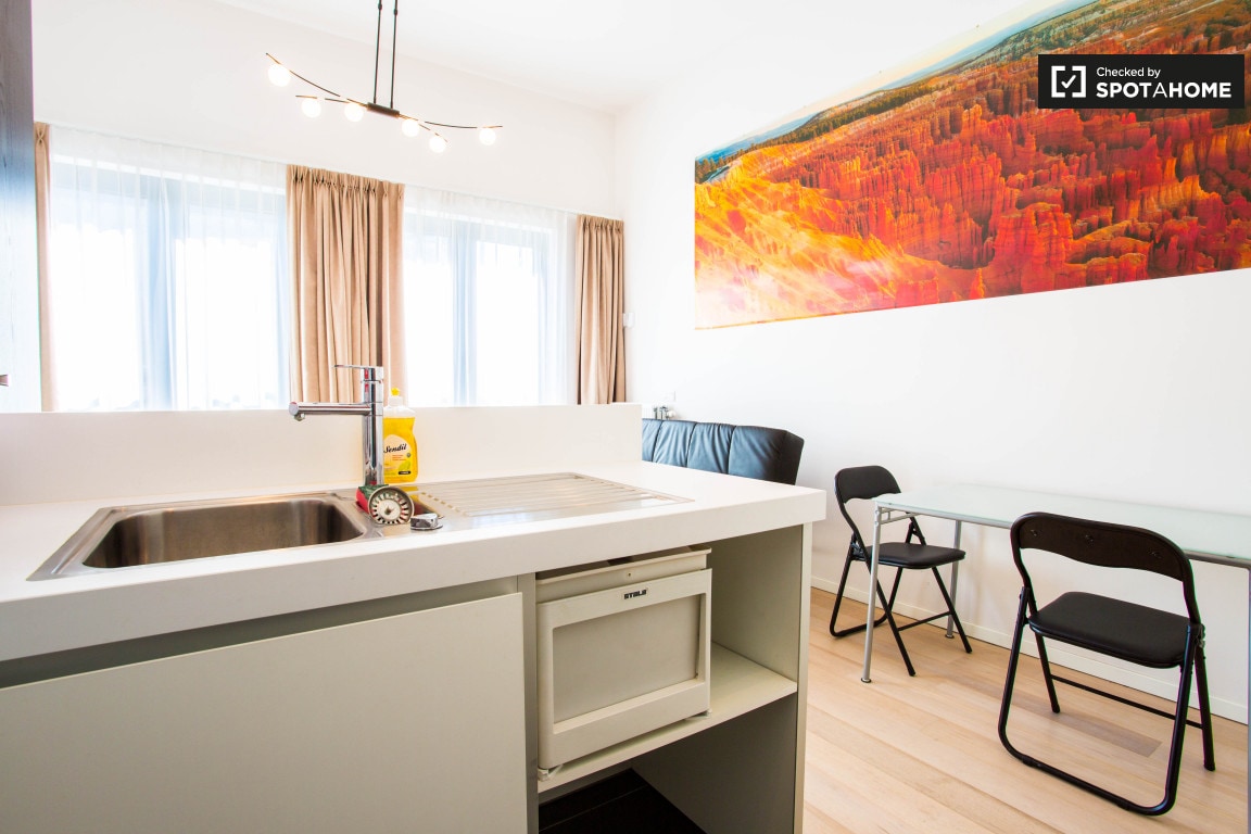 In a green setting, in the center of Belgium, close to all highways, a part of our 70's house has been converted into a studio with all modern conveniences and comfort to accommodate 2 adults and a baby / child: tv, high speed internet / Netflix, king size bed, washing machine / dryer, WC dressing, walk-in shower, complete kitchenette ... Totally privatized (entrance, parking, garden, terrace), without vis-a-vis your privacy will be respected.