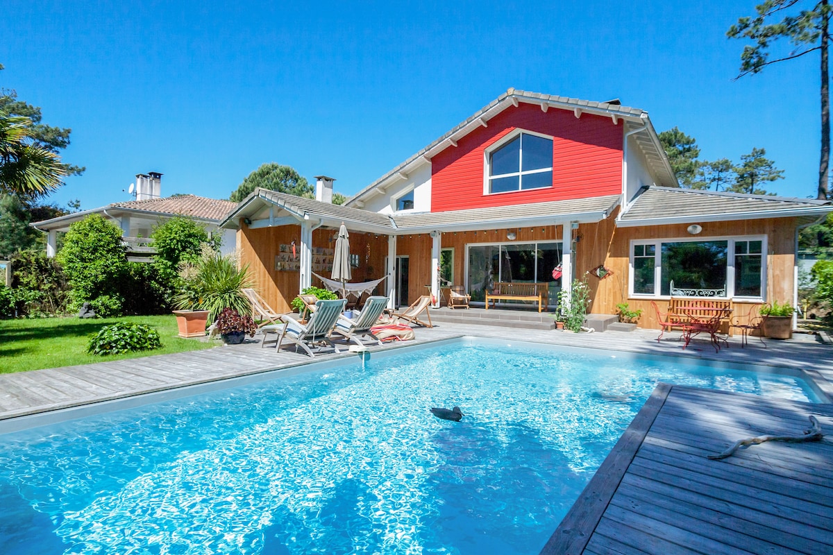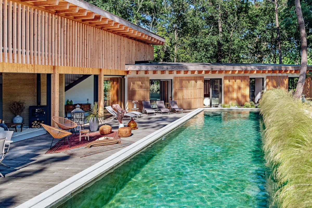 En lisière de forêt, SPLENDIDE maison neuve climatisée avec une piscine chauffée par panneaux solaires, décorée avec goût et amour. Vous vous sentirez comme chez vous avec la douceur d'être en vacances dans un lieu très agréable, CONFORTABLE et tendance. Tout est prévu pour que vous ne manquiez de rien. En quelques minutes en vélo, en voiture ou à pied, vous pourrez profiter du bassin d'Arcachon et de ses belles plages. N'hésitez plus, réservez votre séjour paisible pour vous faire plaisir.