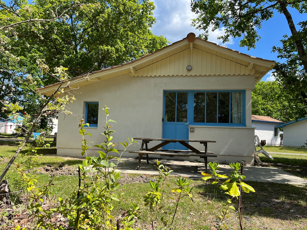 A Arès, idéal pour vacances en famille, au milieu des pins, au calme, sans voiture, maison indépendante 4/6 pers, terrasse, séjour, kitch équip, 2 ch, sdb, wc Accès libre à l’espace piscines, douches et sanitaires communs, terrasses, transats, salle de gym, laverie. Restauration sur place ou à emporter "La cabane" À pied, plage, lac de baignade de St Brice, nombreuses autres petites plages, par les pistes cyclables accès à l'océan et forêt, proximité des marchés et ports d’Andernos et Arès.