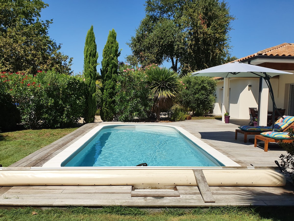 Maison en bois, récente, au calme, avec une piscine chauffée du 1er mai au 30 septembre, dotée d’un volet et d’une alarme, ainsi que d’une belle terrasse. Bienvenue dans une maison apaisante et dépaysante, dont la situation est idéale pour découvrir le bassin. Plage et port ostréicole à 15 min. à pied. Patio lumineux, aménagé en family room. Maison bien équipée (plancha, enceintes, fibre, clim…). Literie neuve (lits queen size)