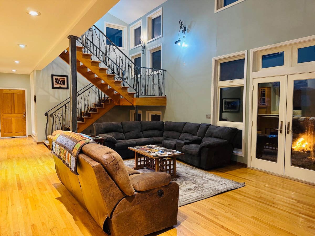Unwind at the Lodge, a beautiful cabin getaway located in Garnett, Kansas. The perfect place to enjoy a relaxing summer vacation, or cozy up to the wood stove in the winter months. Located in the woods just a five minute drive from town, with a picturesque pond view and wooded trails. Two bedrooms with a king sized bed, and one bunk room that can sleep up to five. Three full bathrooms. Washer and dryer included, large tv, and full kitchen.