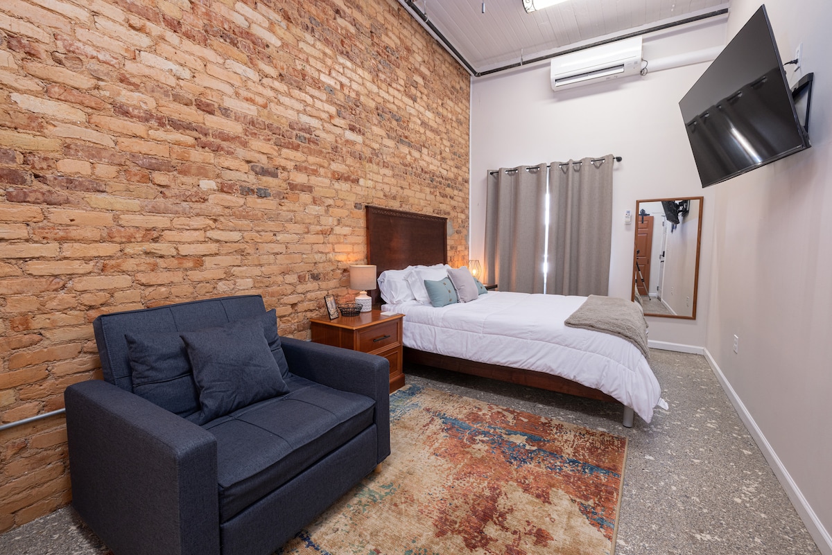 Located in historic Downtown Hartwell, Hartwell Suites offers a unique boutique hotel experience with modern suites laced with historic charm. SLEEPS 4 Queen bed along with a trundle sofa with two twin mattresses. FULL KITCHEN With a refrigerator, microwave, dishwasher, coffee maker and a two-burner induction stove top. The microwave can also be used as a convection oven and an air fryer. ADA COMPLIANT The bathroom features a roll-in shower, large doorways, and open floor plan.