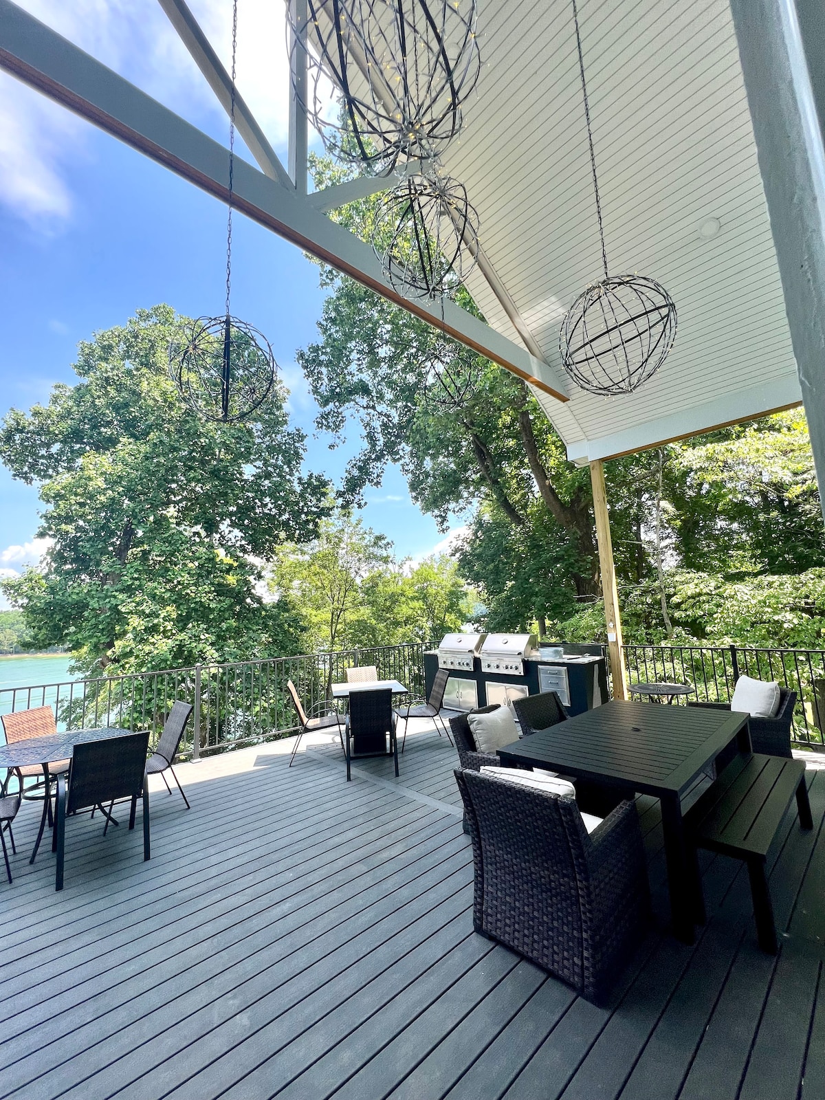 Full basement with outdoor spaces overlook the neighborhood lake surrounded by a half-mile walking trail. Through the patio entrance is a large game area with ping-pong/pool, a family room with seating for eight and an 80in TV, kitchen with microwave, mini-fridge/separate freezer, Keurig and two-burner cooktop, as well as various tables to seat 14 total. Two bedrooms and a full bath with tile shower are tucked away. The king room has a balcony with a lake view and the queen room has air hockey.