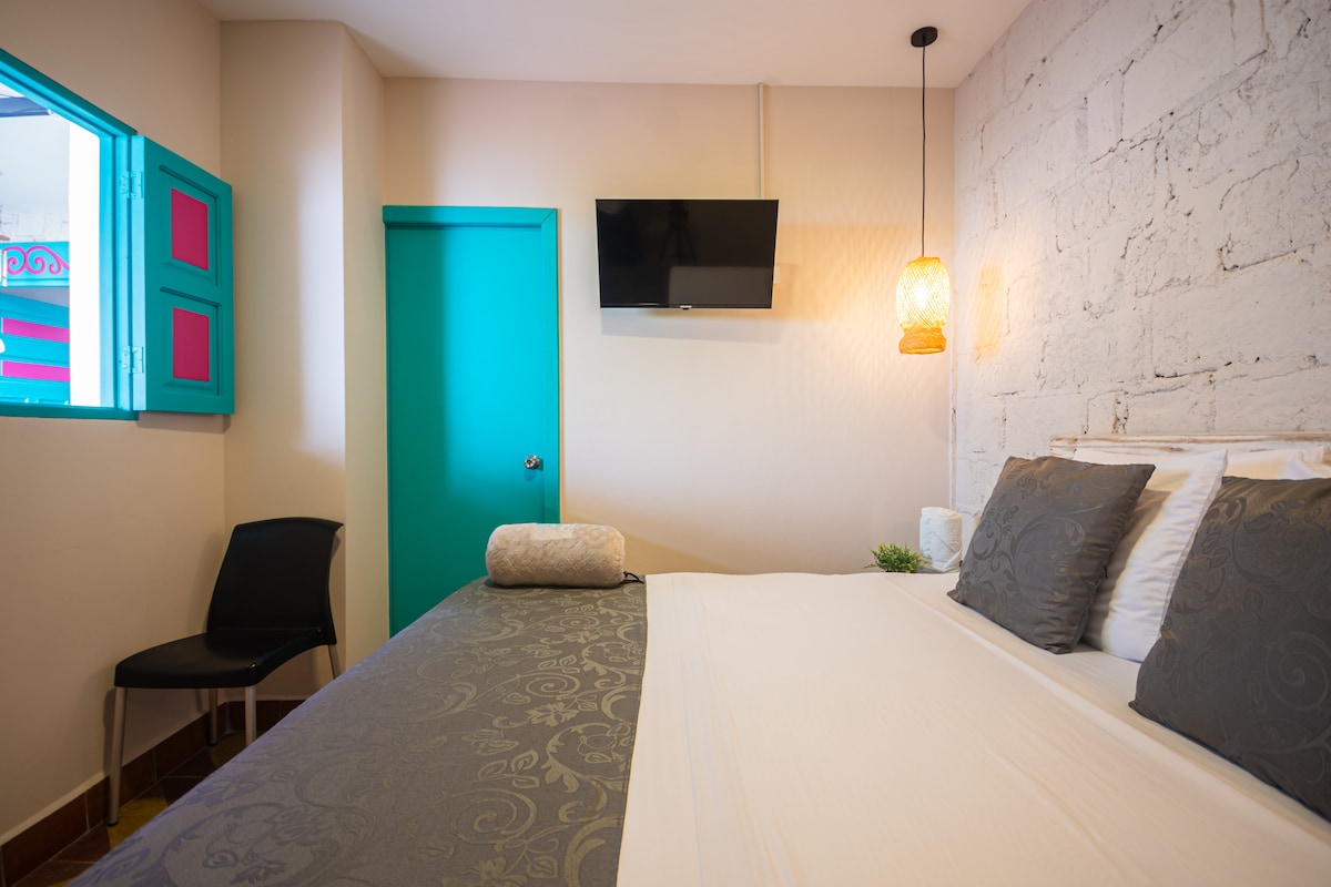 Habitacion en segundo piso con ventana para la parte de atrás del hotel, perfecta para descansar en la comodidad que se brinda con Cama de 1.40, Smart TV, Baño privado con agua caliente. Disfruta del fácil acceso a tiendas y restaurantes y lugares de interés ya que estamos ubicados a una cuadra atras del parque y al lado de arriba del Teatro Municipal, podras disfrutar de un buen descanso, buen precio y calidad en nuestro servicio. Encuentra también en el Hotel nuestra Agencia de Tours aliada.