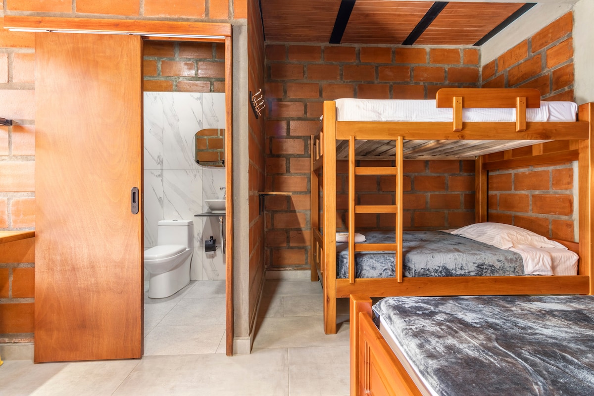 Cómoda y moderna habitación privada, que cuenta con una cama doble, un sofá cama, baño privado, escritorio, 2 mesas de noche, maletero, clóset, caja fuerte. Incluye desayuno tipo bufé, barra libre de café, agua, aromática, y experiencia de preparación de café. Ademas cuenta con acceso a zonas comunes como deck, zonas verdes y salas de estar. Es un espacio campestre rodeado de aves, naturaleza y café. fácil acceso a solo 10 minutos del parque principal.