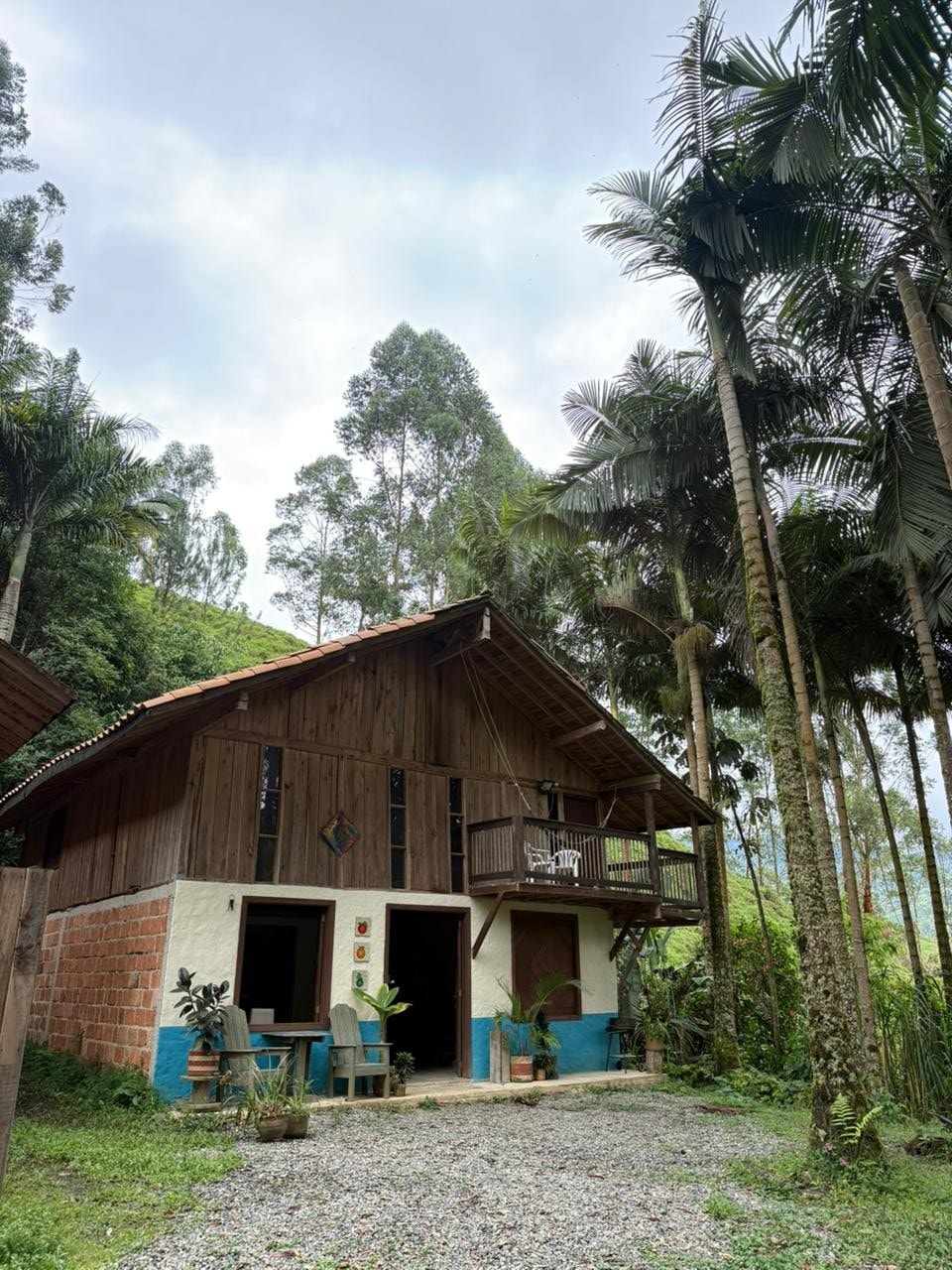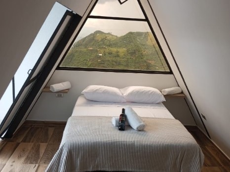 Two-level cabin with sky view. Private bathroom and accommodation capacity for up to 5 people. Located on a rural estate in Jardín, Antioquia (15 minutes by car from the town). We offer bilingual service and breakfast. Nearby activities include coffee/honey tours, bird watching, horseback riding, Chorro Blanco waterfall, and Cueva del Esplendor cave. Ideal for families, couples, and freelancers. We provide Starlink Internet with speeds up to 220mb. National Tourism Registry No. 221026
