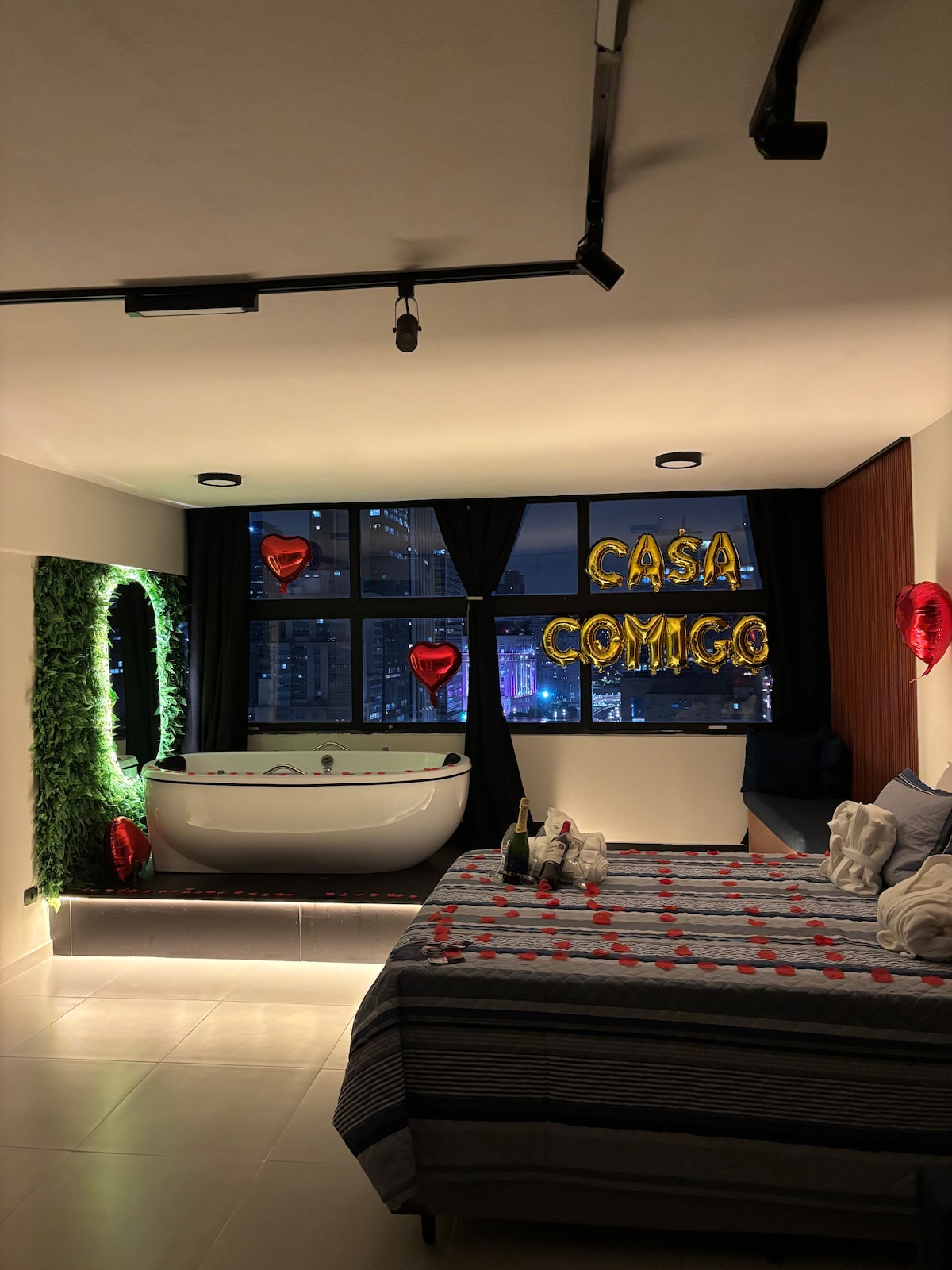 Apartamento com vista incrível da cidade, ideal para uma experiência a dois. O espaço combina design moderno, banheira para momentos de relaxamento e ambiente aconchegante para casais. Perfeito para desacelerar, curtir a vista, brindar juntos e aproveitar São Paulo de um ponto alto e reservado, com conforto e privacidade. Um lugar moderno, tanto na decoração, quanto com a experiência da Alexa. Uma experiência única!