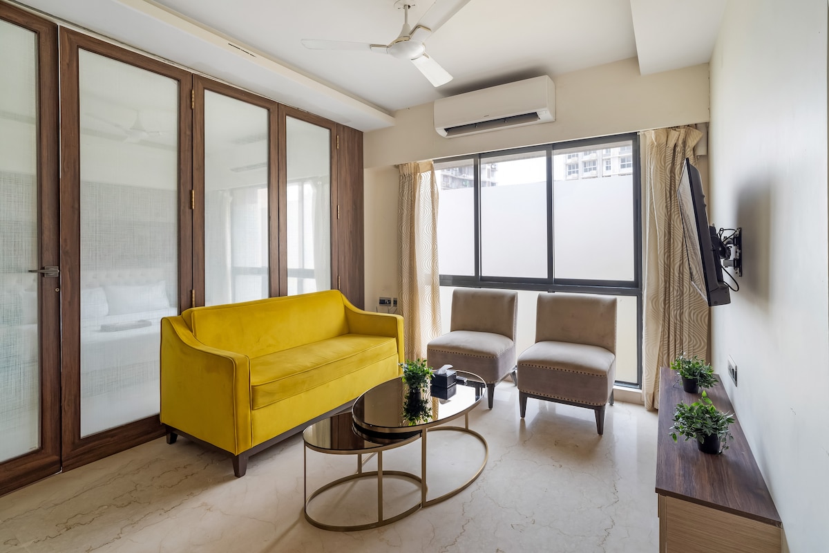 Welcome to Your Modern Day-Chic 1-Bedroom Apartment Retreat near BKC! With its minimalist design, ample workspace, entertainment options, and essential amenities, it caters to the needs of both business and leisure travelers! Features: ★ Large Work-Desk ★ Free High-Speed WiFi ★ Smart TV ★ Tata Sky with all HD Channels ★ Sound Bar ★ Microwave/Fridge ★ Air Fryer ★ Air Purifier ★ Water Purifier Book now and experience the perfect blend of modernity and comfort!