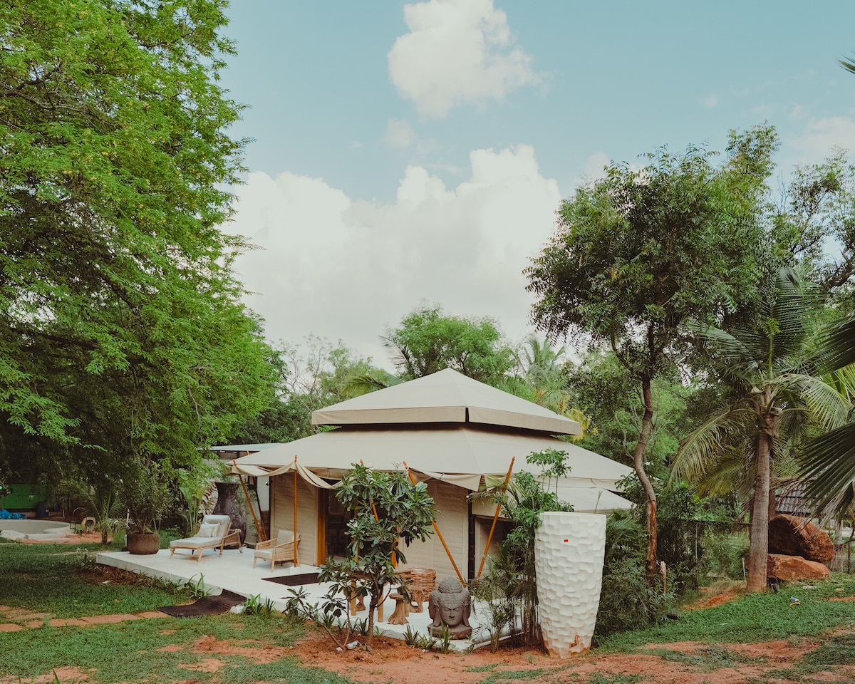 Set on a peaceful one-acre tropical estate, this pet-friendly fibre tent offers an earthy and grounding stay featuring a grey-stone bathtub and a private patio shaded by a beautifully layered canopy. Guests can unwind by the palm-lined shared pool, stroll through tranquil garden spaces adorned with natural accents, or find quiet moments in the charming thatched gazebo. When evening falls, the sunken firepit becomes a cozy, inviting spot to relax and connect beneath the stars.