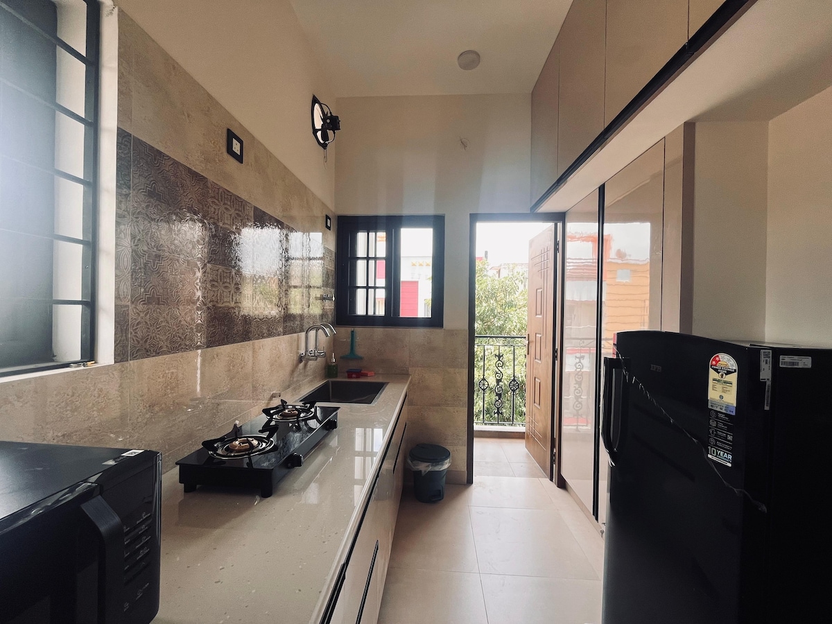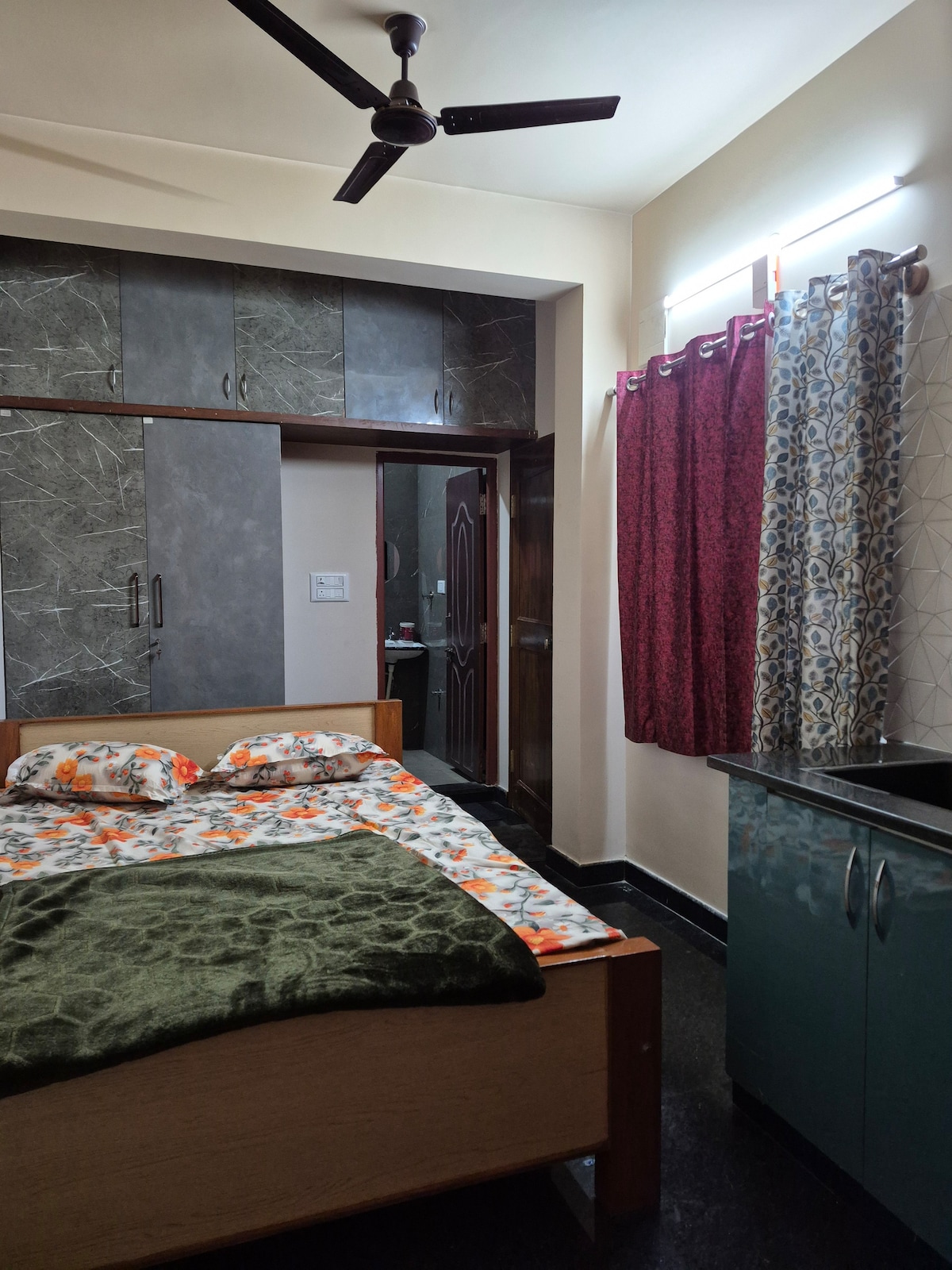 Spacious 600 square feet Designer 1BHK Suite with Private Balcony | High-Speed fibre optic Wi-Fi & Smart TV with streaming platforms, Work/Dining Desk, 24/7 power backup for uninterrupted work and comfort |Luxe King Bed & Orthopaedic Mattress ,wooden wardrobes for storage | fully equipped Kitchenette | Couch Bed in living room , Max.Occupancy 4 | Elevator access, professional housekeeping and access to paid laundry on site for long stays| Located in Central Bangalore | LGBTQIA++ Affirmative