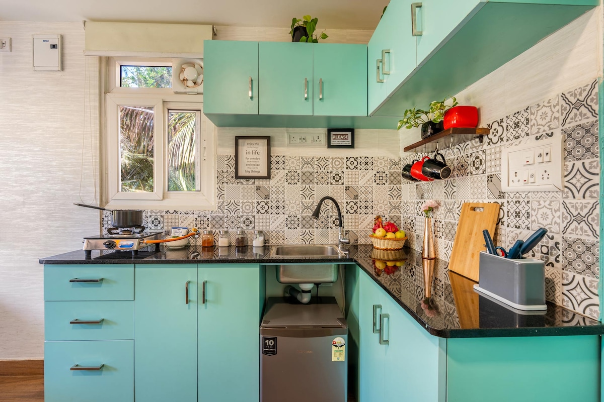 Your home away from home in Bangalore has been tastefully decorated to a Earthen theme. Every corner of our home is Instagramworthy with colourful interiors, kolam art, antique decor and more. The 1BHK can comfortably accommodate up to 4 persons with a king size bed in the living room. While there are plenty of restaurants nearby, our kitchen has been thoughtfully equipped for all your needs - be it to make a quick omelette or a full Indian meal. So sit back, relax and sip your coffee.