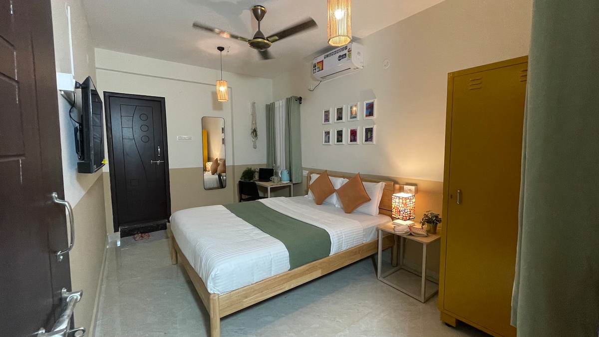 It’s a one bedroom , Hall ,kitchen apartment at seco d floor, the only flat in that floor with safety and privacy. Relax with the whole family at this peaceful place. Kitchen is full functional. Smart tv available. WiFi good signal strength and a spacious hall and bedroom for max three adults. You get to stay at prime area of v Perungudi behind world trade centre BSR Mall and cinemas &KSR Food steeet . Apollo hospitals and gem hospitals is nearby,