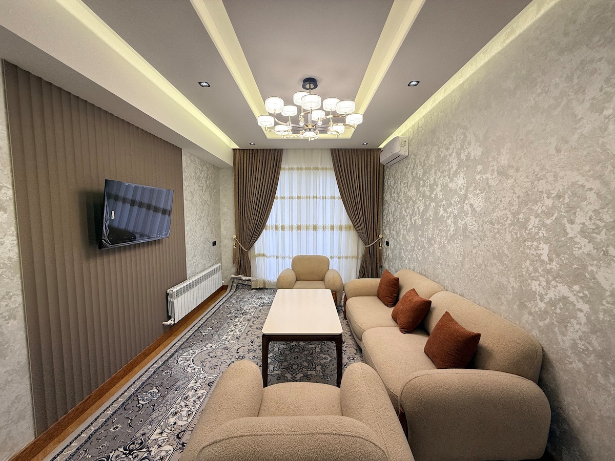 Stay in the heart of Andijan with comfort and style. This modern apartment offers a bright living room, dining area, and fully equipped kitchen. Large windows bring in plenty of natural light, while the cozy bedroom ensures restful nights. Conveniently located near cafés and shops—perfect for both short getaways and longer stays.