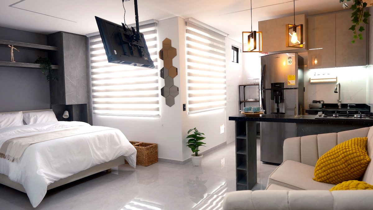 The Sky es un aparta-estudio dúplex ideal para quienes buscan diseño, tranquilidad y comodidad en Bogotá. Su arquitectura tipo mezzanine, acabados contemporáneos y un ventanal de techo a piso llenan el espacio de luz natural y crean un ambiente moderno y acogedor con vista a las montañas. Ubicado en Cedritos, un barrio seguro y residencial, cerca de cafés, restaurantes y parques, con excelente conexión. Beneficio exclusivo: sin tarifa de servicio Airbnb. Pagas el total, sin cargos ocultos :)