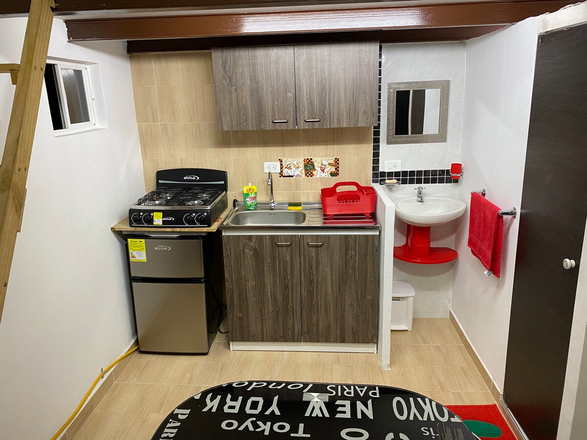 Este acogedor apartaestudio es de uso exclusivo, independiente y privado consta de una habitación amplia, con una cama doble, TV, clóset y mesa de escritorio, baño con agua caliente y una cocineta con nevera la cual tiene lo necesario para cocinar como ollas, loza, cubiertos y otros adicionales. El apartaestudio se encuentra ubicado en la parte de atras de la casa principal, por lo que la entrada es compartida entre ambos. El apartaestudio tiene una buena iluminación, es muy limpio y acogedor
