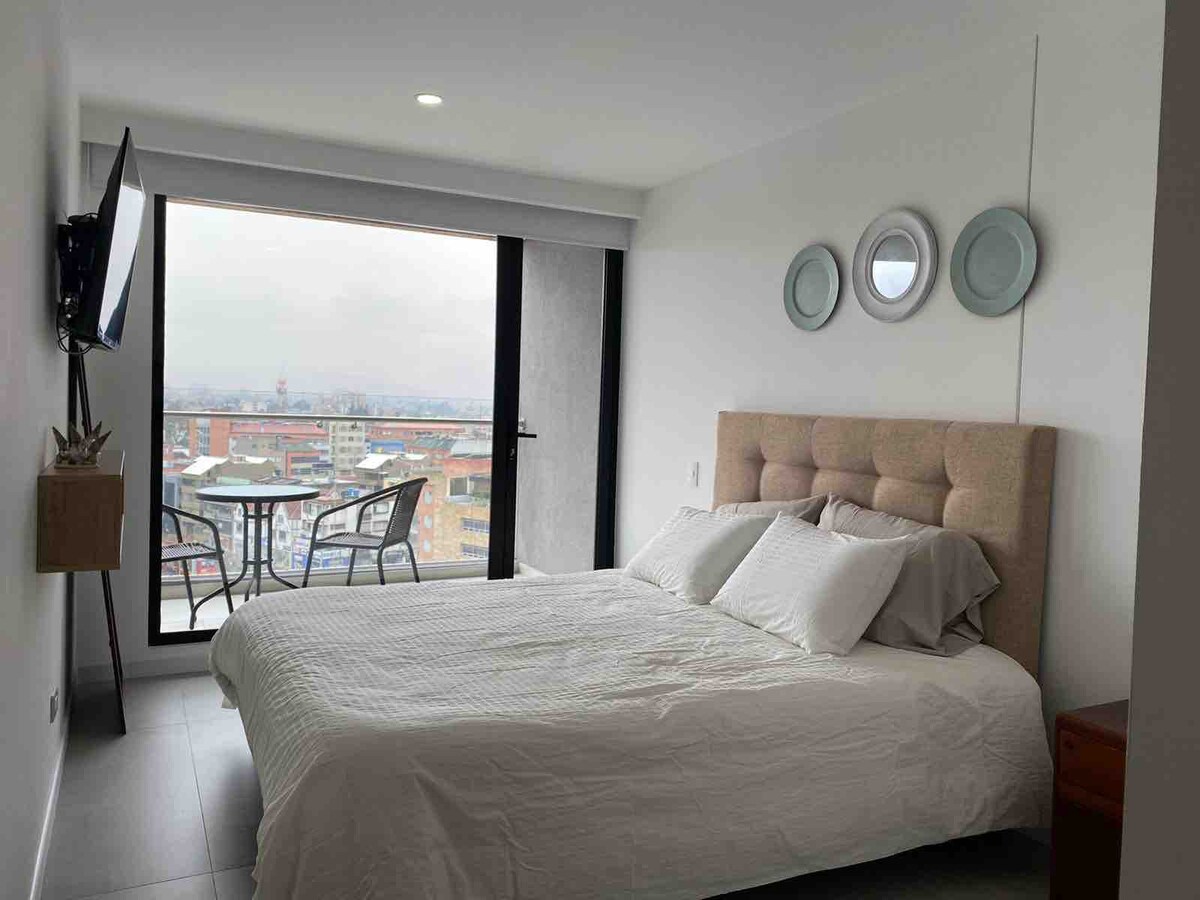 Disfruta de un loft premium en el corazón de Chicó Un espacio moderno de 27 m² con balcón privado, cama de lujo, sábanas extra suaves, cortinas motorizadas, espejo con Bluetooth y luces LED de última tecnología. Ideal para estadías largas: cuenta con escritorio ergonómico, WiFi 5G y Smart TV con Netflix, Disney+ y Prime Video. Incluye lavadora propia y opción de limpieza semanal con cambio de lencería. Vive Bogotá con estilo y confort.