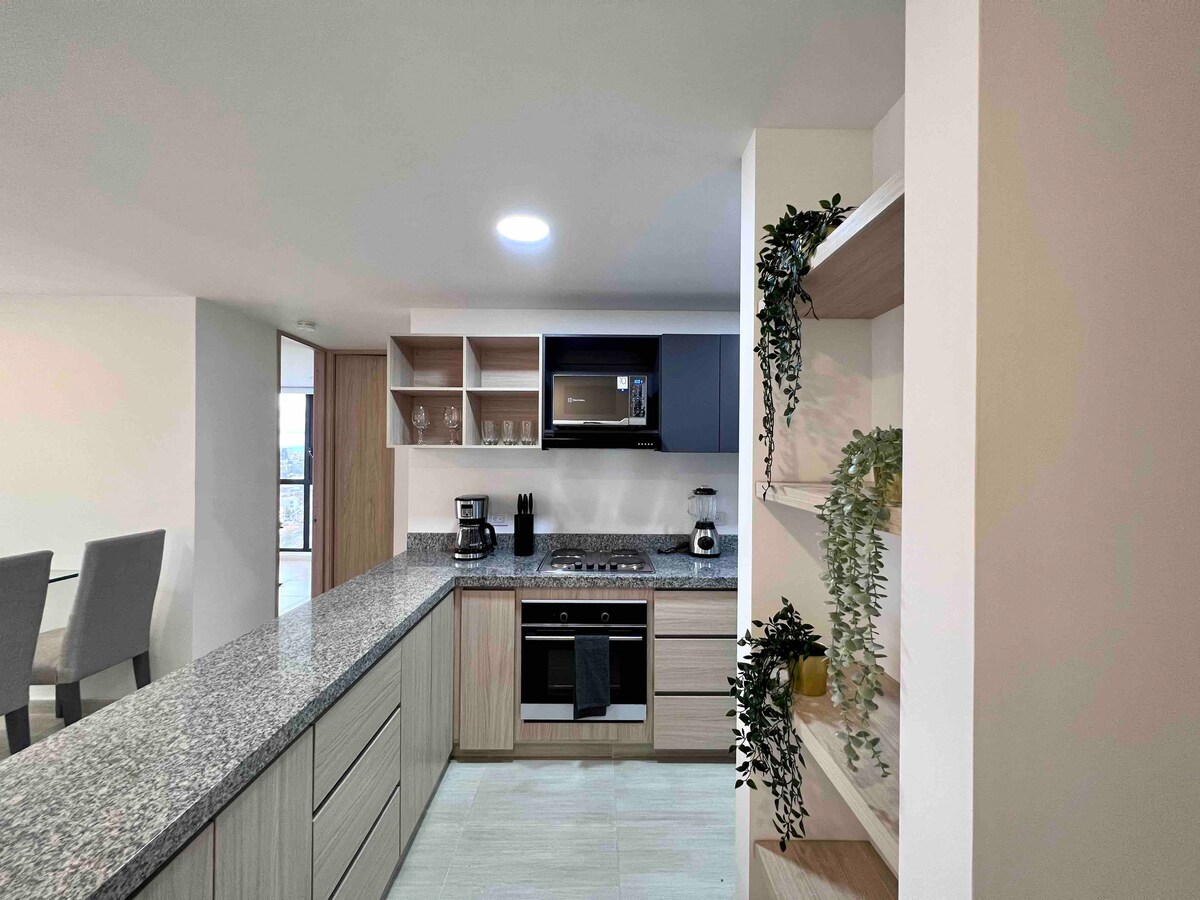 Welcome to a stylish and centrally-located place! Gorgeous 15th floor apartment with an UNBEATABLE VIEW. Our building offers top-of-the-line amenities, including an indoor pool, sauna, spa room, gym, terrace, bar, and rooftop restaurant. You'll feel like you're staying in a hotel with the convenience of an Airbnb. Close to Parque 93, you'll have the opportunity to experience local and international cuisine from some of the best restaurants in the city.