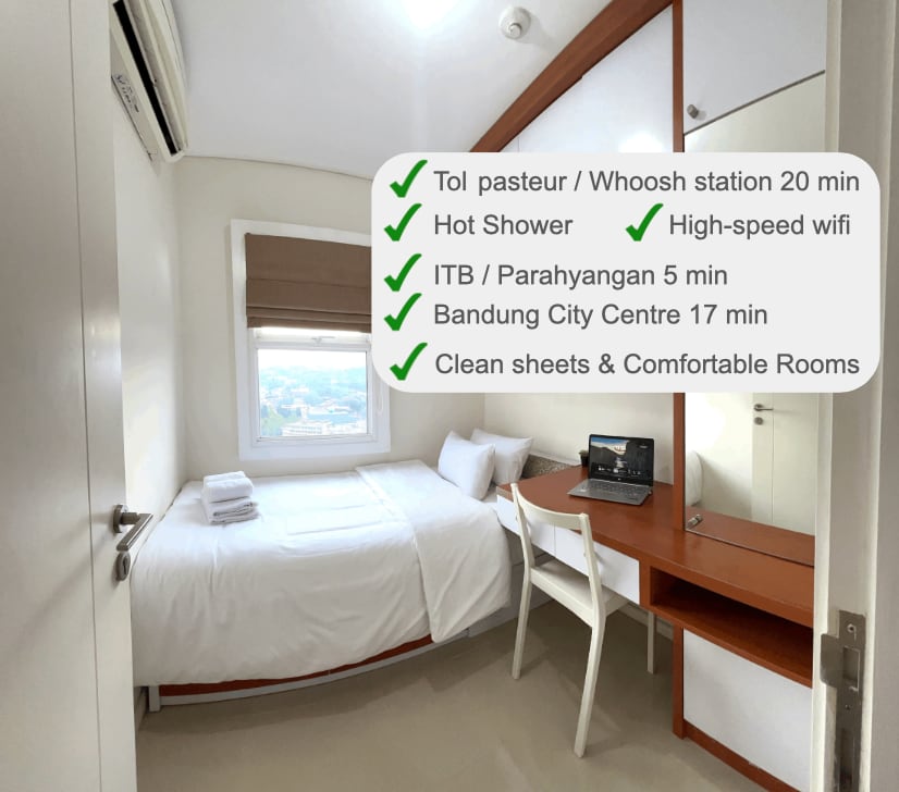 It's not just a room to sleep, It's a home to stay FREE CAR Parking (min. 2 nights stay) 4 min to Simpang Dago/car free day(600m) 4 min to ITB (750m) 5 min to Bandung Zoo (1.4km) 6 min to UNPAD Dipatiukur (2km) 10 min to Cihampelas Walk(3.2km) 10 min to PVJ Mall (3.5km) 15 min to Dago Pakar (4.8km) 19min to Braga City Walk (4.9km) 30 min to Lembang Park&Zoo (12km) Enjoy a view of Bandung from 12th Floor✨—Located in Beverly Dago Apt 15% Disc weekly stay 20% Disc Monthly stay