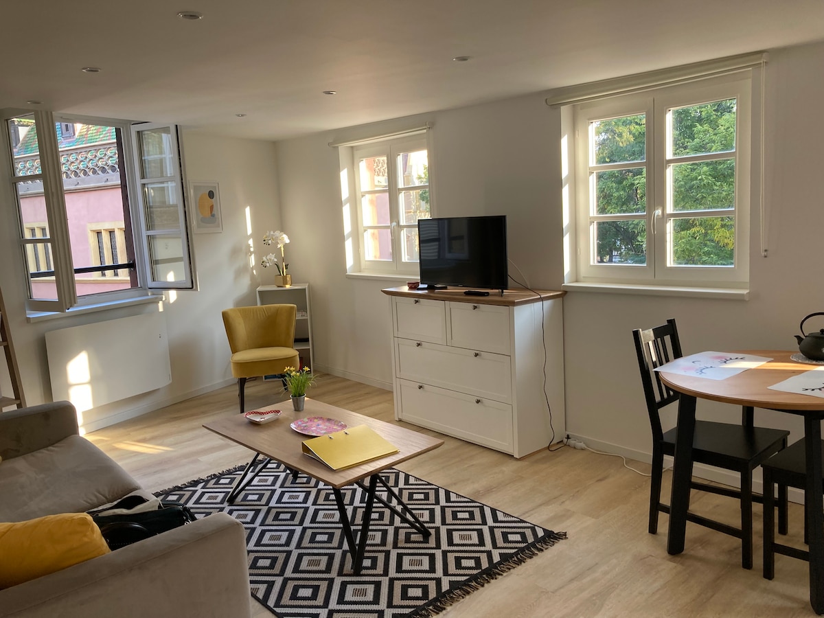 Bienvenue à la maison, bienvenue à la Petite Venise ! Animaux acceptés ! Cet appartement cosy, chaleureux, entièrement rénové spécialement pour les voyageurs, situé au 1er étage, saura vous séduire par son orientation plein Est donnant sur la place où se tient le marché de Noël des enfants... une vraie féérie ! Décoré de façon originale et atypique, l’appartement vous séduira immédiatement ! La célèbre Petite Venise se trouve à 50m seulement ! Un parking se trouve juste devant l’immeuble !