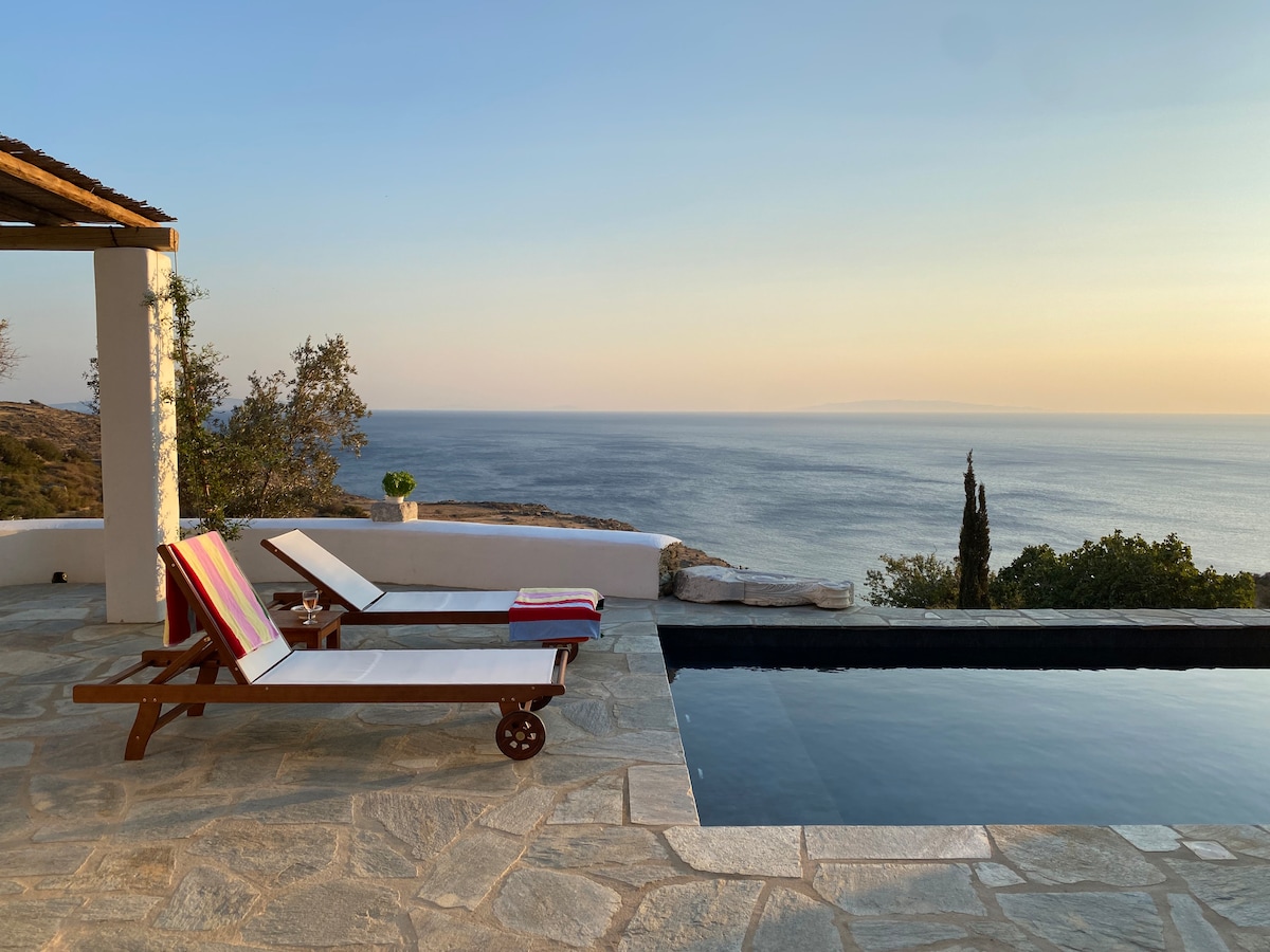 Welcome to our house in Andros. Away from neighbors and noisy areas, in a 2-acre lot, it is ideal for those seeking a peaceful and relaxing vacation. It is roomy and pleasant, with cozy internal and external spaces and breathtaking Aegean views. It is located at the southwestern coast of the island and it is very convenient for exploring it. It is ideal for families and friends seeking escape from the ordinary.