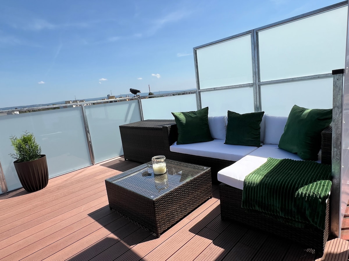 Nový luxusní dvoupodlažní Apartment 12 s novou velkou terasou, výhledem na Olomouc a masážní vanou. Apartment se nachází kousek od centra .. hned u parku Flora. Zastávka MHD Wolkerova a Penny market 100m. V dolním podlaží je koupelna s masážní vanou, obývák s kuchyní . Ve druhém podlaží se nachází útulná ložnice s elektrickým krbem. Nevýhodou je 5 patro bez výtahu ..