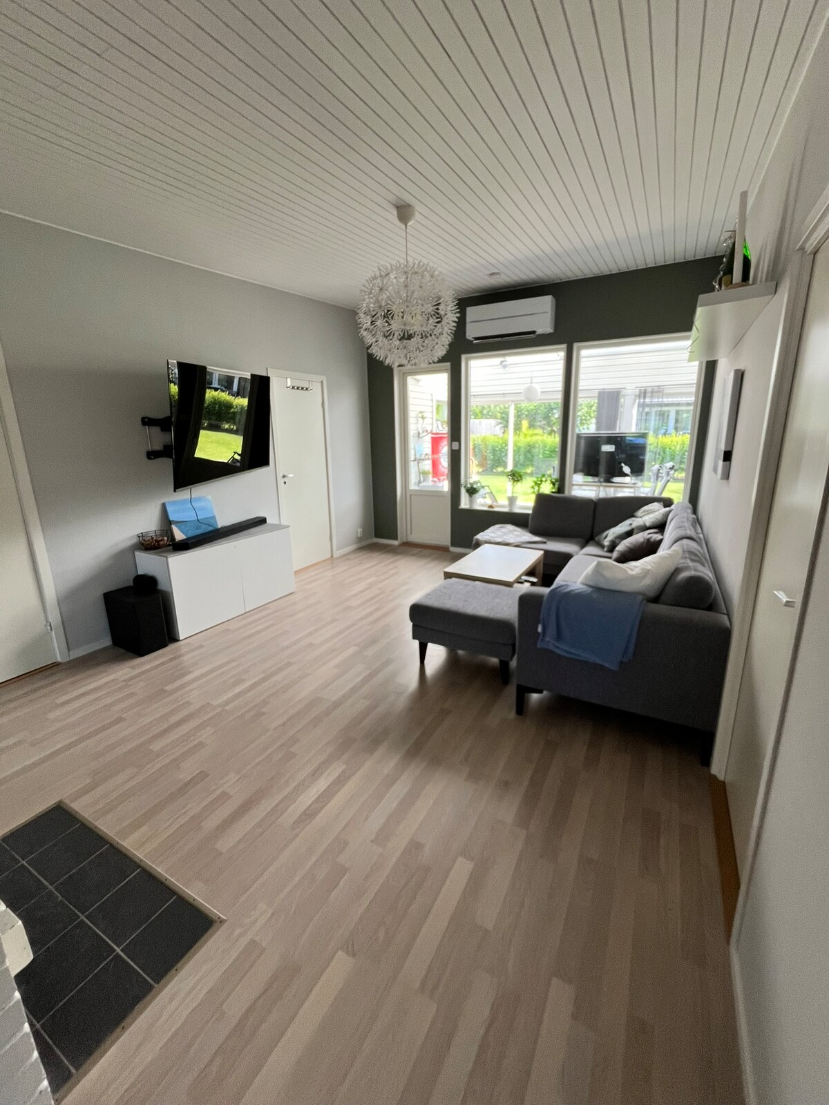 Modern ground floor apartment with own front door. Own access to the apartment and garden with patio. Free parking at the apartment. Bed linen and towels included. Apprecciated accommodation for business travelers. Weekly and monthly discount. Quiet residential area close to E4. 50 m² with kitchen, bedroom, bathtub, washing machine, living room, sofa bed. Upon booking, you will receive a personal code for the front door's smart lock. 250 meters to grocery store, bus stop. 4 km to the town center