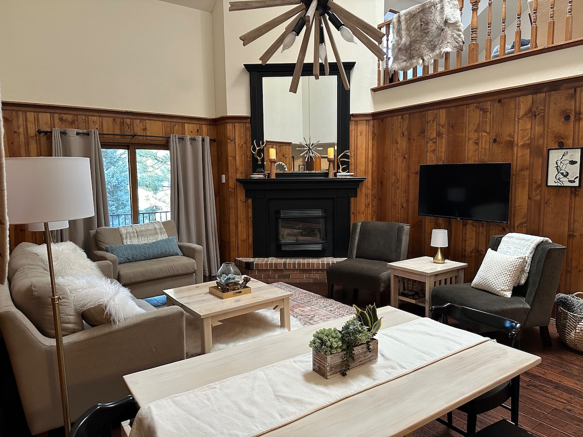 Remodeled just last year! Sure to be the coolest condo in Angel Fire! 😎 This fun rendezvous is nestled in the woods of the Pinetree Commons complex. It's only 2 blocks from the AF Resort. Close to skiing, biking, hiking, golf and more! Grab a drink and enjoy one of the 2 outdoor balconies or cozy up by the fire. The interior is fun and inviting... with eclectic murals and decor offering a different experience than anything in the area! Perfect for families/friend groups! 😊