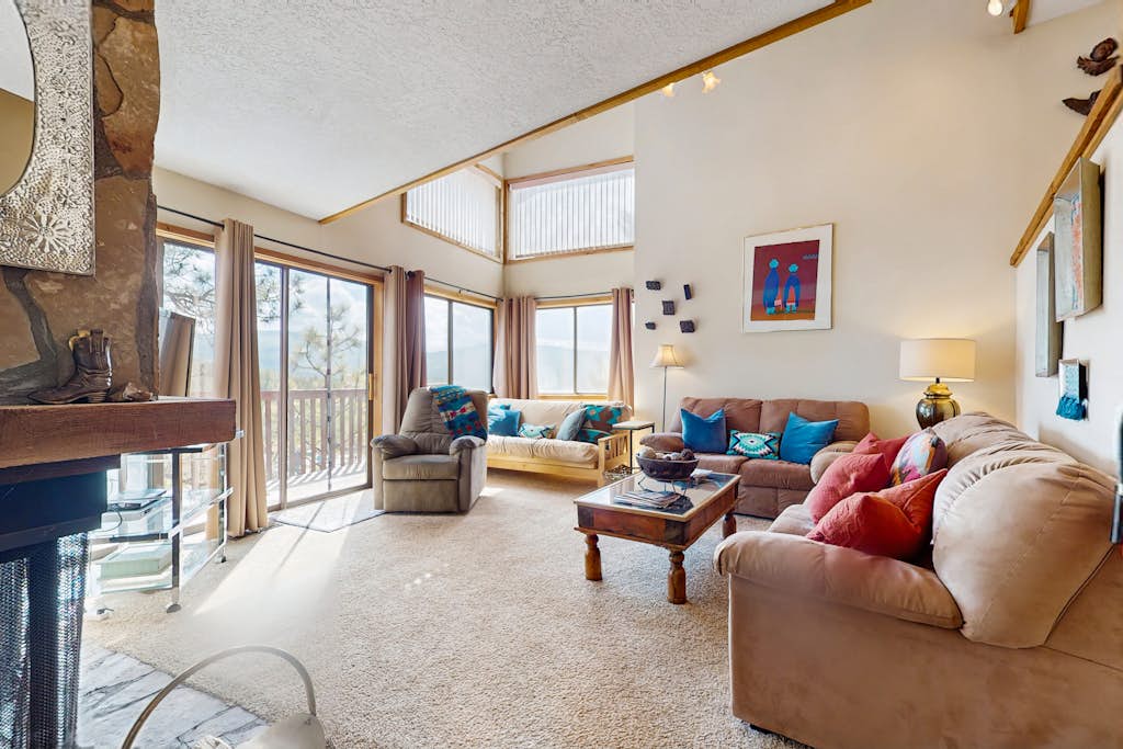 Remodeled just last year! Sure to be the coolest condo in Angel Fire! 😎 This fun rendezvous is nestled in the woods of the Pinetree Commons complex. It's only 2 blocks from the AF Resort. Close to skiing, biking, hiking, golf and more! Grab a drink and enjoy one of the 2 outdoor balconies or cozy up by the fire. The interior is fun and inviting... with eclectic murals and decor offering a different experience than anything in the area! Perfect for families/friend groups! 😊