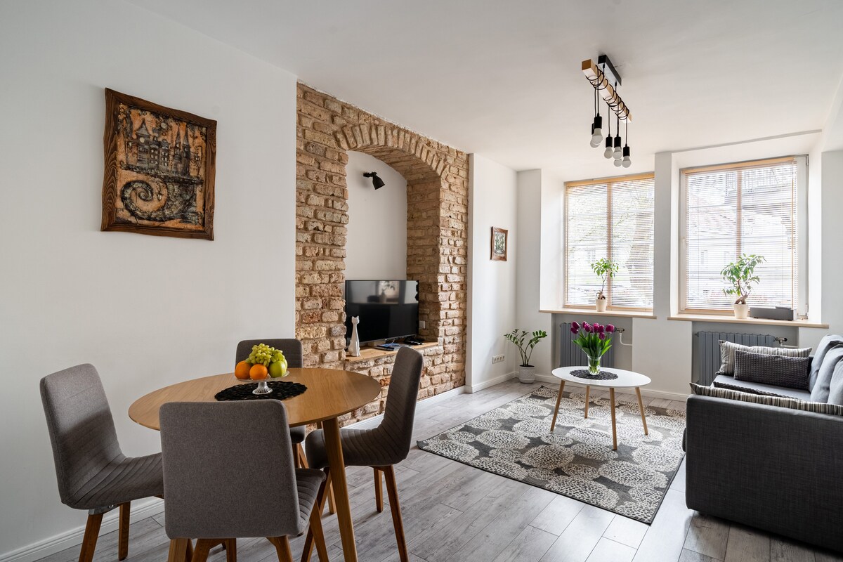 Newly decorated apartment in the heart of Užupis near the angel statue. 33sq.m. There you will find a bedroom with a large double bed, a bathroom, and a living room with a fully equipped kitchen. You can see the magnificent view of the city Vilnius through the windows and the music you play from the Gramophone will leave a cozy atmosphere in the apartment. Even though the apartment is located in the main street it is a quiet place to stay because the apartment is situated inside the yard.