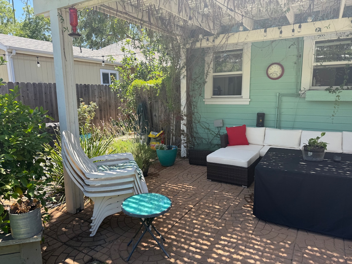 This quaint guest house has a very comfy king bed and an air mattress (if needed please let me know). Beautiful walk in tile shower access to wash the day away. Guests have access to the garden, patio, and gas fire pit. There is a private entrance and I welcome all people from all walks of life. If you are booking this space for someone else please get prior approval. You will assume all risk for them and are responsible for getting them the check in instructions.
