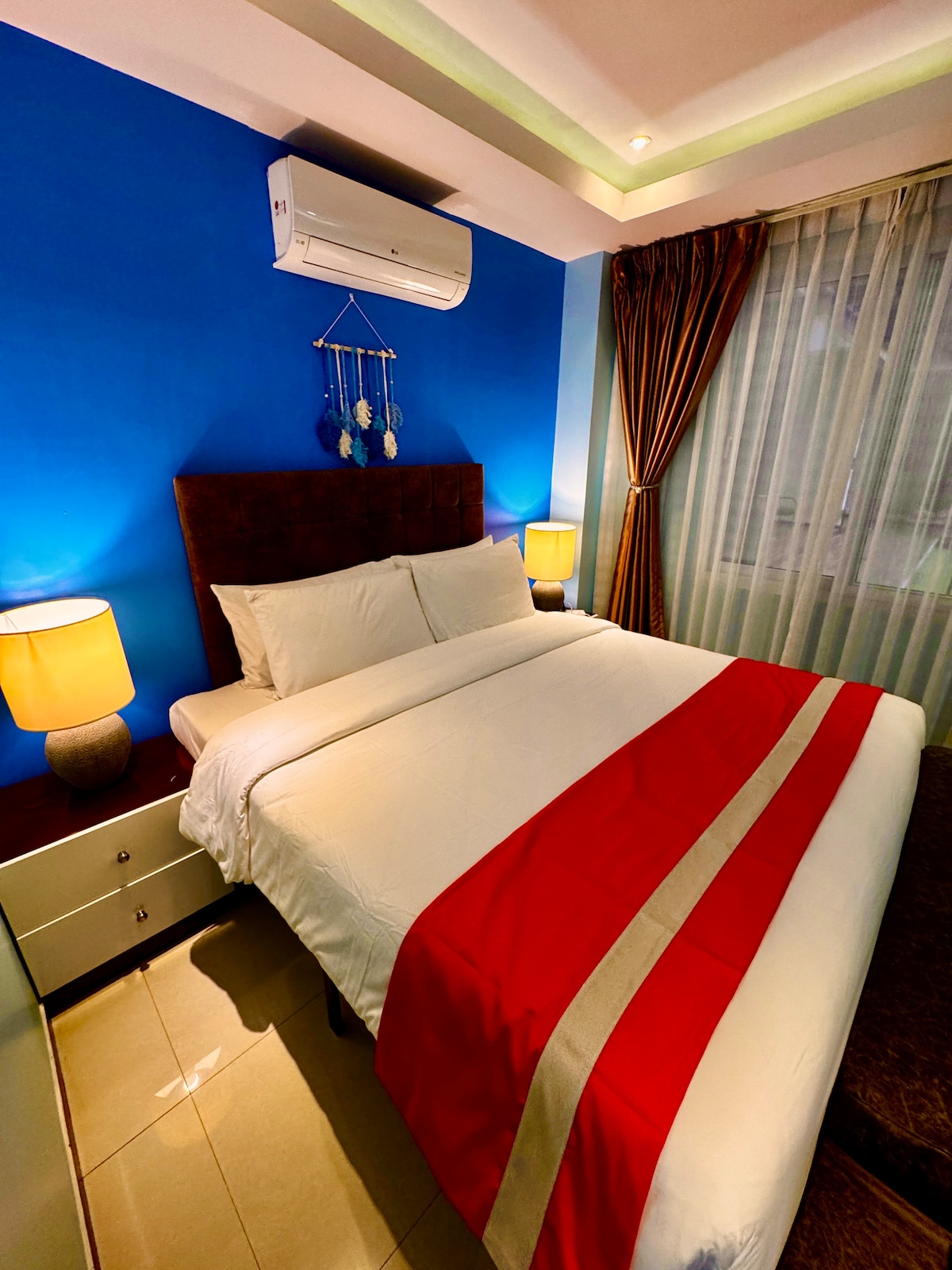 Kick back and relax in this calm, stylish space. This 43 sqm Deluxe Studio is fully furnished and equipped with a 65 inch smart TV and Google play, a big frigde with freezer, free wifi router, air-conditioning, fan, full equipment of kitchen utensils incl. electric kettle, rice cooker, toaster, water dispenser, aso.... This building has groundfloor pool, 2 sky pools, hot jacuzzi, a gym, a spa incl. Sauna and Steam, Restaurants, Skybar, gaming room, 4 elevators and a free parking lot