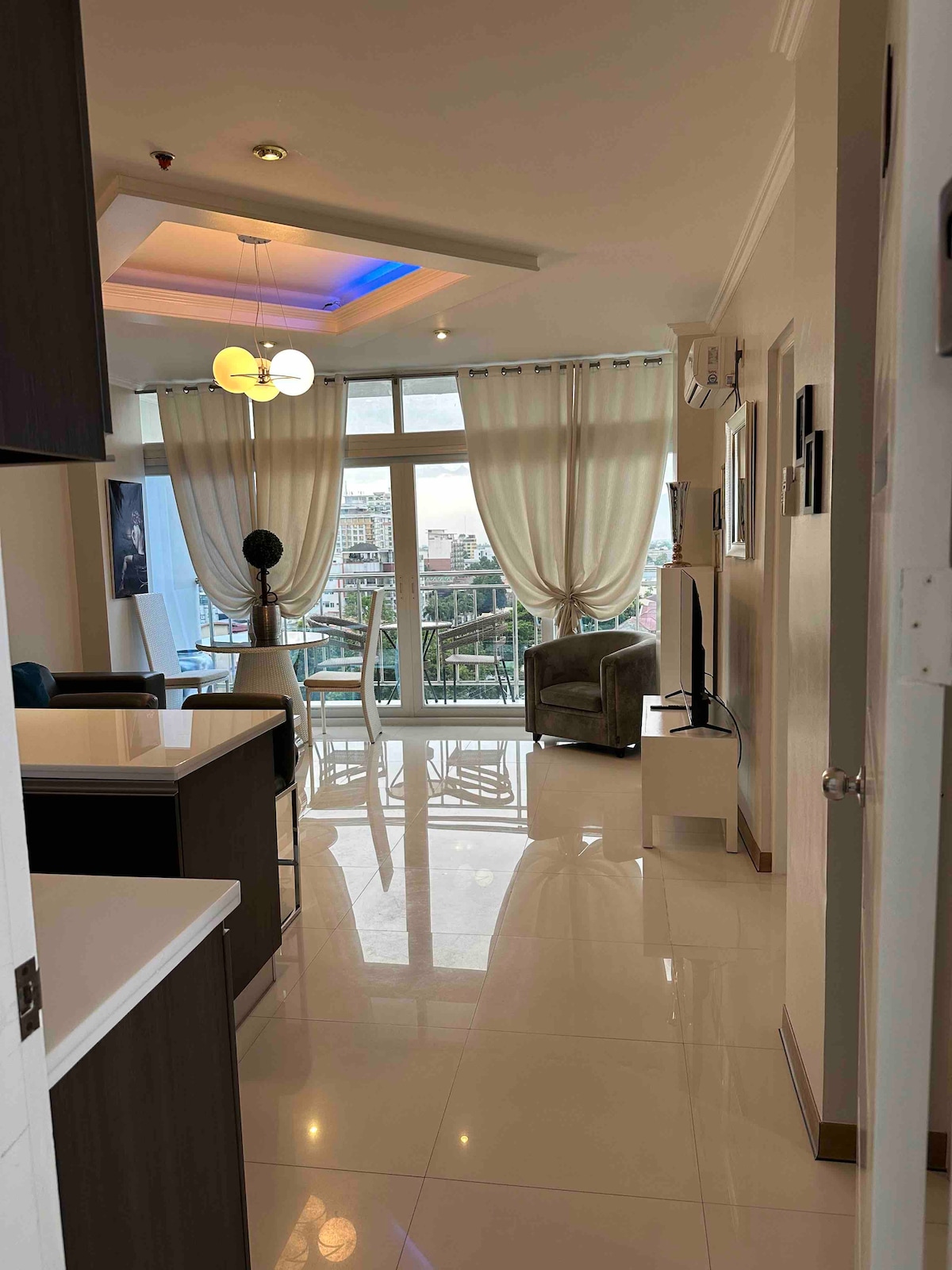 A newly refurbished luxurious one-bedroom apartment perfect for 2-3 guests. The apartment is 65 sq m, located on the 7th floor of Kandi Towers 2, with a fantastic view of Mt. Arayat.