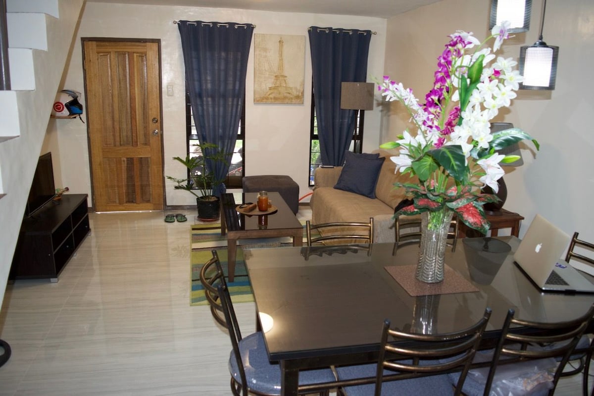 A modest, comfortable, fully air-conditioned, 2-story, 2-bedroom town house less than a five minute walk from Fields Avenue on Sur Luisa Street (the spelling in the listing is "Sor" but "Sur" will give a more accurate map location). Quiet, well maintained block. Almost everything you need will be provided for your stay.