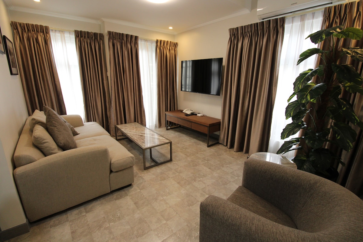 If you want to see a video of the apartment - YouTube: La Grande Residence Philippines 1002 Description Apartment (93m2) • 2 bedrooms (king size bed / queen size bed) • 2 bathrooms • 30 square meter living room with 65 inch smart tv • Big balcony equipped with balcony furniture • Fully equipped kitchen • Potable water • Internet • Aircon in all rooms • Washing machine, hairdryer, iron and iron board • Working desk with display to connect your laptop