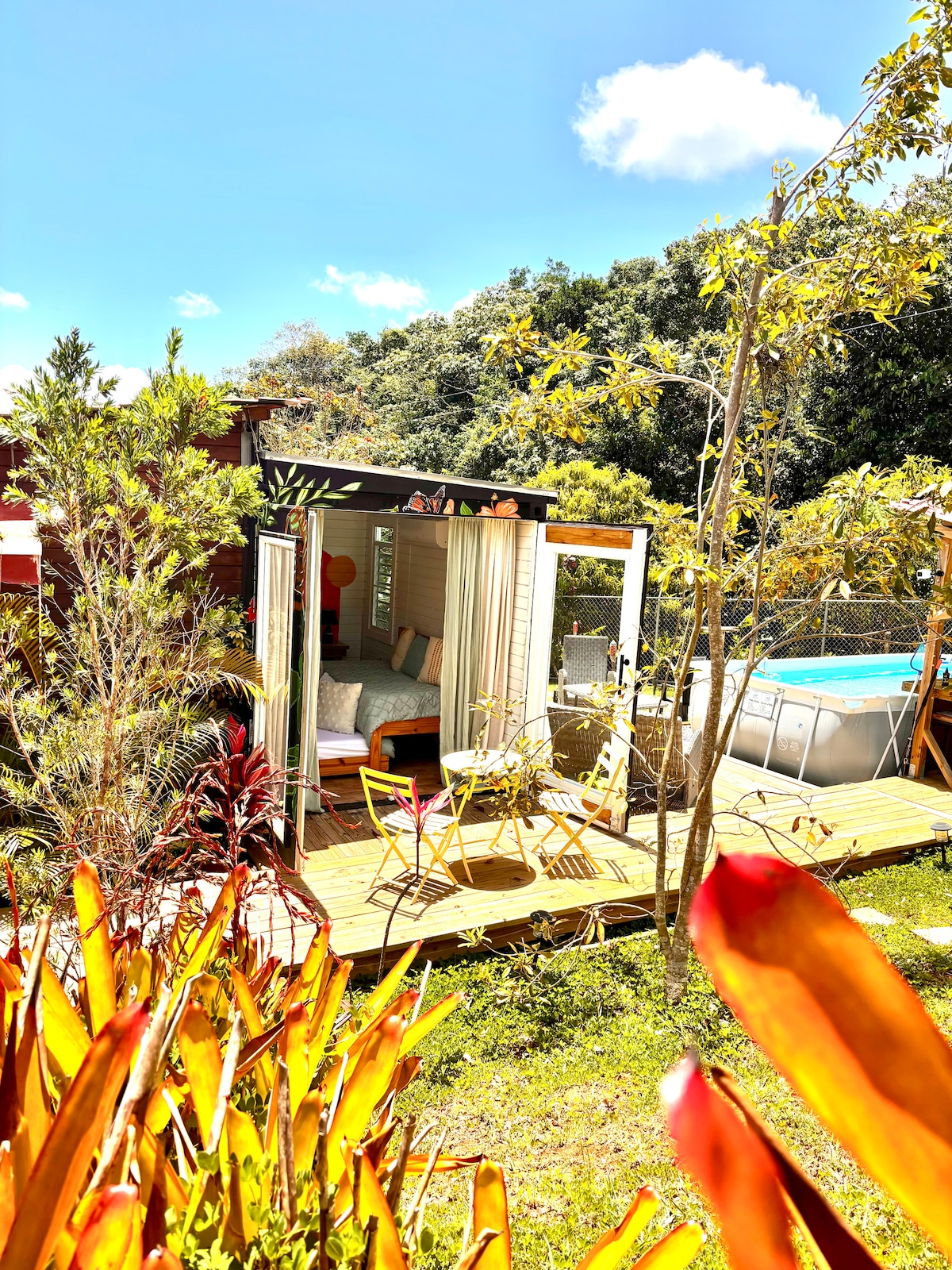 Enjoy 2 Unique Container Houses with pool, two fire pit areas, Wi-Fi, A/C, workspace, smart TVs, and two equipped kitchens! 2.08 acres of tropical forest. Experience breathtaking sunrises and sunsets. Admire panoramic mountain views. Cool off in the over the ground pool. Gather around either of our two fire pits for memorable evenings. Cook delicious meals on the wood-burning grill or in our outdoor kitchen. Stargaze from the wooden decks. Hike through the forest and spot a variety of birds.