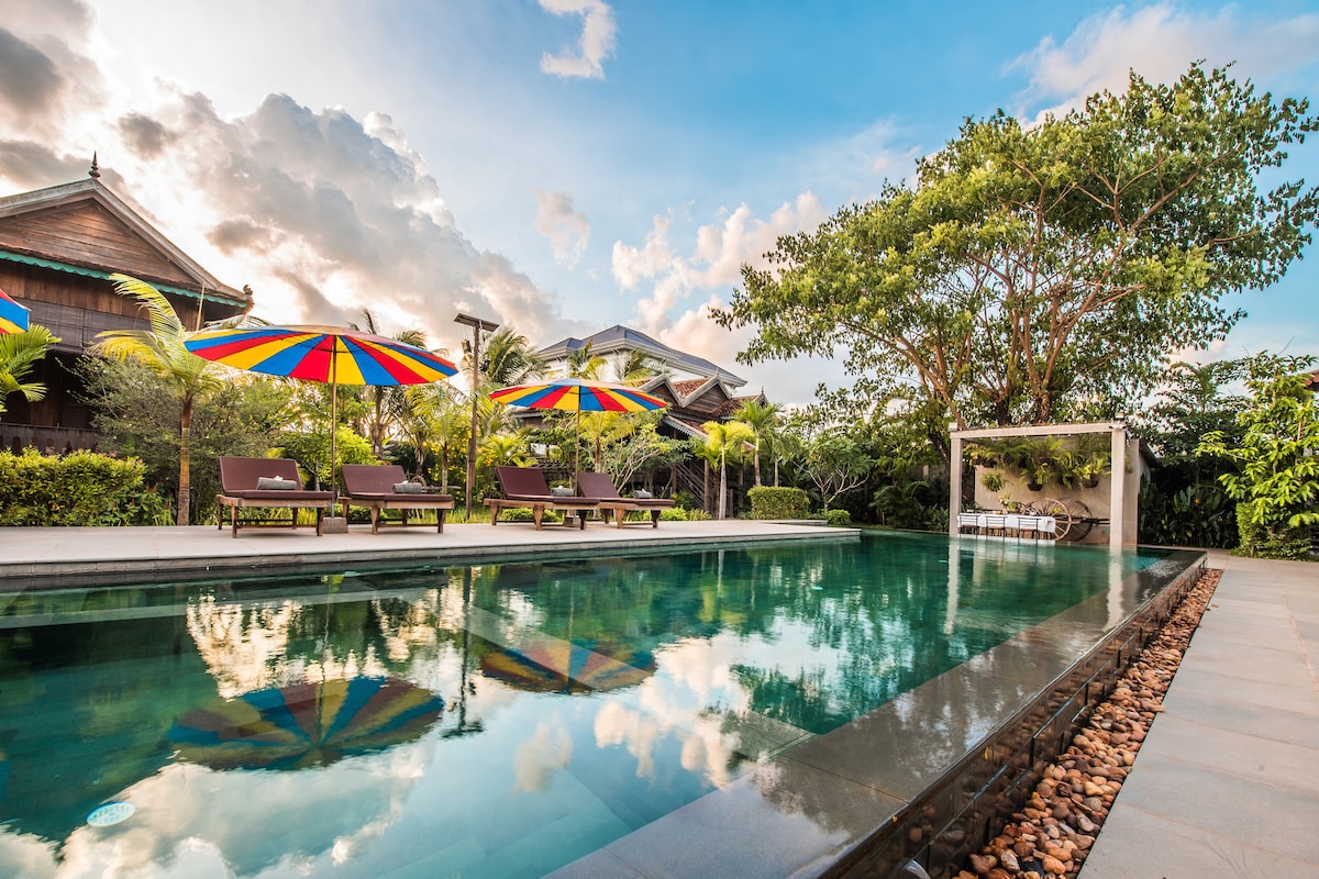 Beautifully designed, pleasant, private, and relaxed villa in central Siem Reap - only a 3 minute tuk tuk ride or 10 min walk to Pub Street (Old Market Area). Our place has its own pool and beautiful courtyard that will keep you entertained during your stay. The villa features a king-sized hotel quality bed and linen that will ensure you get a great nights rest after long days exploring all that Siem Reap has to offer. The villa has a huge en-suite bathroom with rain shower.