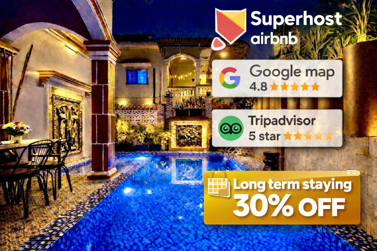 A spacious boutique home of 5 bedrooms with a private pool, built in a unique style of Khmer and Western architecture with an oasis ambiance, located near the largest local market of Siem Reap, only 10 minutes from downtown Pub Street, and 15 minutes to the marvelous Angkor Wat. This beautiful villa is ideal for a group or a family to enjoy a private stay and feel as if you are at home. Authentic Khmer meals, transport/guided tours, and airport transfers could be arranged during the stay.