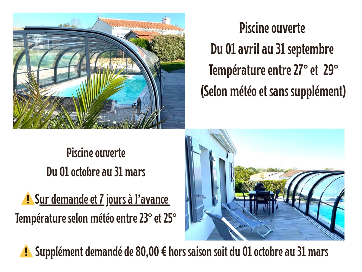 Piscine dans bâtiment de 85 m2 chauffé à 26°,,eau chauffée à 30°. Logement: de 50 m2, 1 chambre un lit pour 2 personnes ,salle/salon canapé réversible 2 places, une cuisine équipée avec lave vaisselle, une salle d'eau ,douche,lavabo, sèche serviettes électrique et WC, plus un préau de 40m2 équipé en salon de jardin, située au calme et sécurisé,à 5 minutes des plages ,30 minutes des sable d'olonne, à une heure du puy du fou, parc d'attraction O'Gliss à 9 minutes, (attractions diverses)