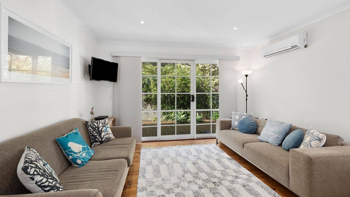 Located just 100m from Anglesea Main Beach, our home is perfectly located for your coastal getaway. This hidden gem is tucked away with ample outdoor space to relax in privacy, and also just a minutes walk to great coffee. The house is made up of 3 bedrooms (2 queens + 1 King beds). Filled with art, books, a big comfy couch and fireplace for and wood fired oven on the new large private deck. We are family friendly, but ask that you respect all of the pieces we have left there for your to enjoy.
